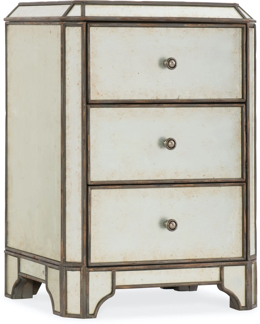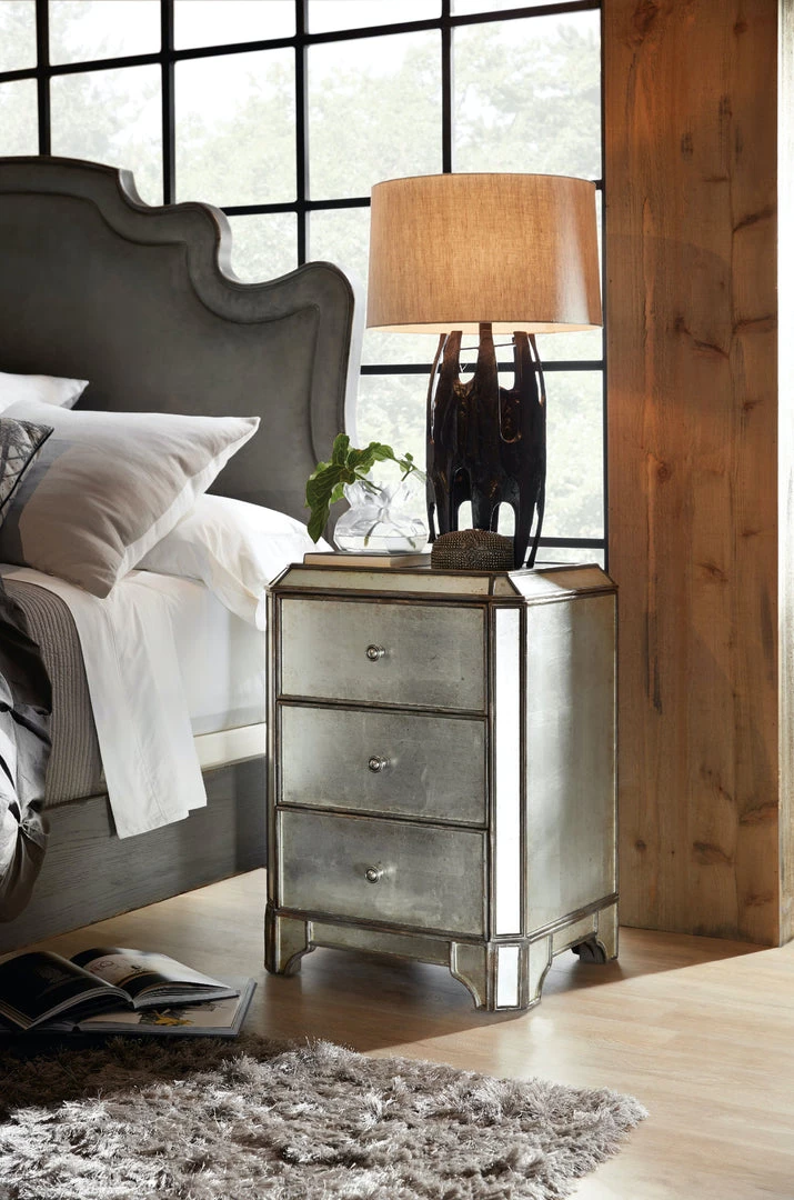 Enticing glam meets cool modern wit in the Arabella Nightstand. Finished in shimmery eglomise with heavily painted charcoal finish on the exposed wood edges, the top drawer has a drop-in felt liner, and the bottom drawer has a cedar bottom. There is one live USB port and three electrical outlets. One touch switch is located on each side of the case; there is a light underneath and a cord clip. A new take on French style that combines classic European elements with modern forms, then adds metals and a touch of glam to create an industrial luxe look. Our Arabella collection marries two of the most pervasive home furniture trends in the last several yearsΒ A Industrial interiors and laid-back luxurious looksΒ Ar a result much greater than the sum of two parts. The new direction takes industrial style, which can become cold and stark, and makes it softer and more romantic by anchoring the look in classic French elements with touches of glam and sparkle.