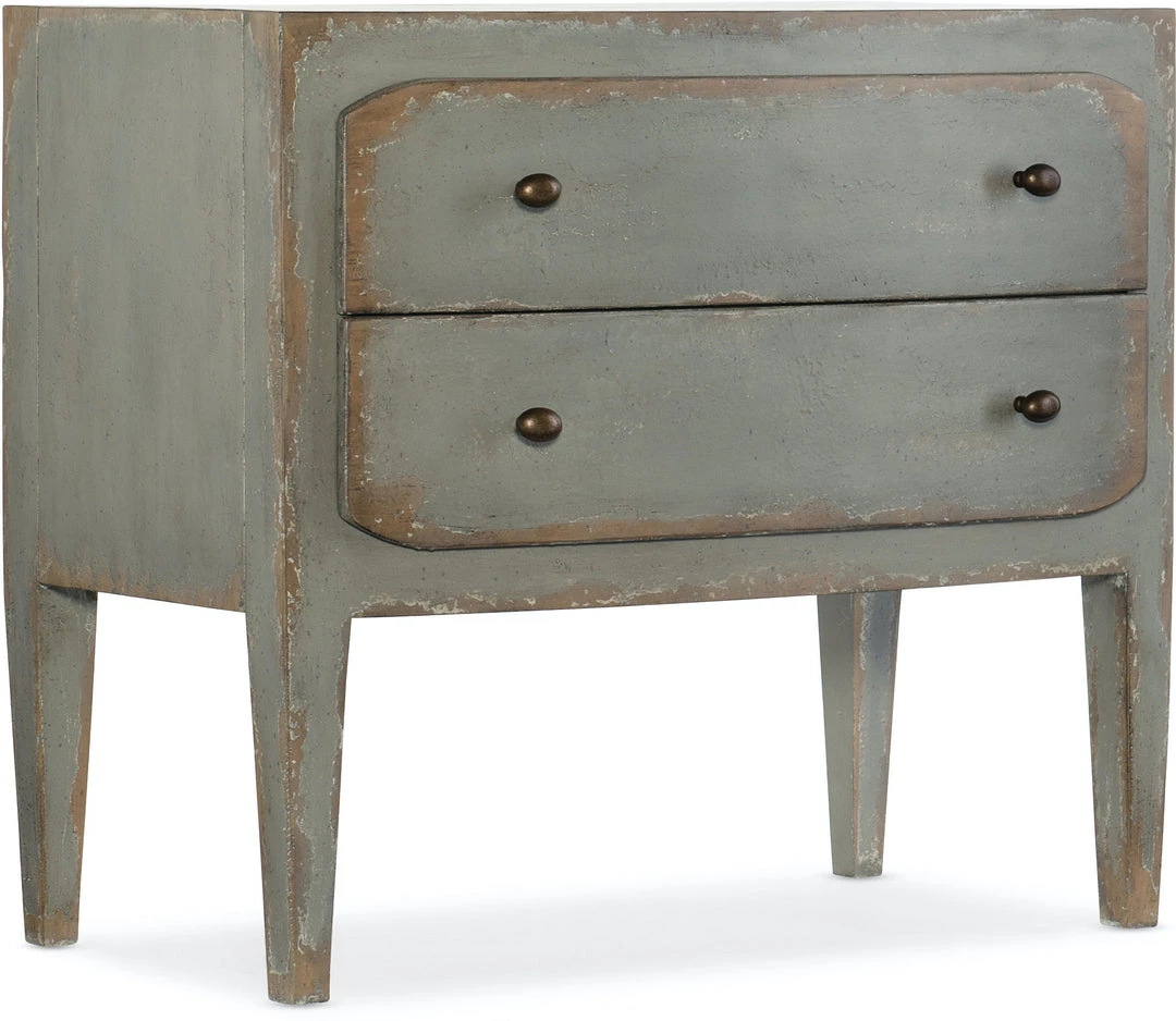 Rustic and romantic, the two-drawer Ciao Bella Nightstand will bring a European farmhouse ambience to your bedroom retreat. Crafted of Poplar and Hardwood Solids with Maple Veneer, the nightstand is finished in Time Worn Gray, a layered and distressed finish that looks like it is aged gracefully through the decades. Features include a drop-in felt liner in the top drawer, cedar-lined bottom drawer, a cord clip on the back and a 3-plug outlet with USB port for charging electronics. Inspired by the small farmhouses that dot the French and Italian countryside and have been in the hands of the same family for generations, Hooker Furniture introduces the rustic Ciao Bella Collection. The whole home collection is an eclectic mix of European farmhouse pieces that have the appearance of furniture that has been refinished multiple times as it has passed through the generations. Ciao Bella includes bedroom, dining room, occasional, home office and accent furniture, and features a finish called Timeworn Gray that accentuates the historical nature of European farmhouses β many of which include a variety of furniture styles that have been added by each generation of owners.