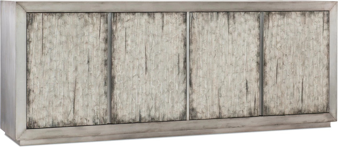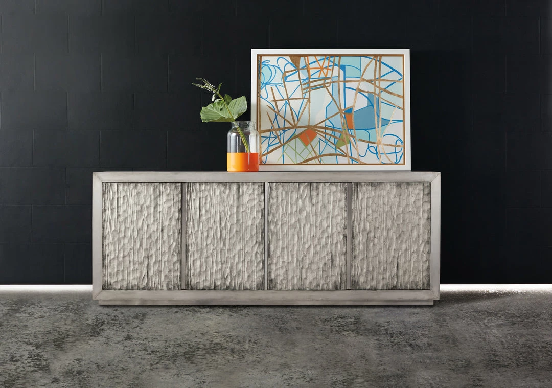 The color of concrete with a softly rugged texture, the artistic four-door Claydon Credenza features a top and end panels wrapped in aluminum sheet for an industrial flavor. Crafted of pine and aluminum, the credenza has soft-close hinges, a ventilated back panel and one adjustable wood shelf behind each set of doors. Come closer to Melange, and you will discover something unexpected, an eclectic blending of colors, textures and materials in a vibrant collection of one-of-a-kind artistic pieces.