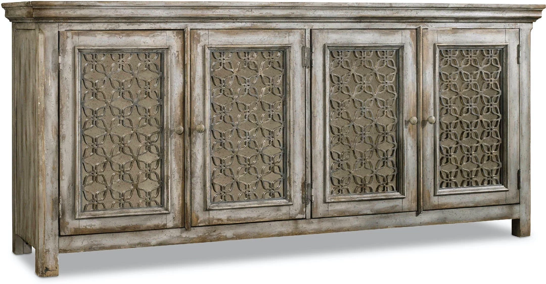 Lacy fretwork in a light Parchment finish over antique mirror on the front of the Dorian Credenza creates inviting intrigue. Crafted of Maple Veneers and antique mirror, the tasteful credenza has a relaxed finish with distressing and offers two sets of doors with one adjustable shelf behind each. Dorian is media-ready with a ventilated back panel. Come closer to Melange, and you will discover something unexpected, an eclectic blending of colors, textures and materials in a vibrant collection of one-of-a-kind artistic pieces.