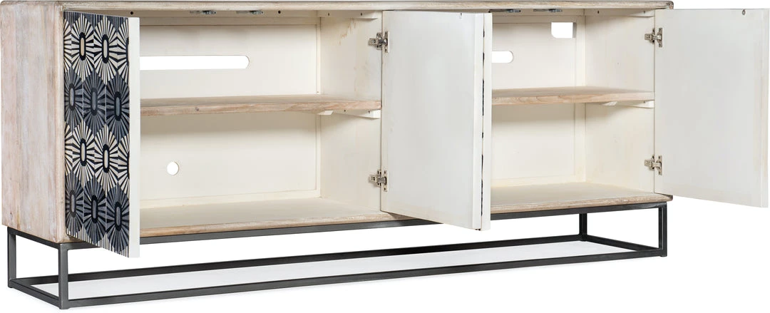 An abstract art pattern created with bone inlay in a black, white and gray color scheme makes the Whitmore Credenza a one-of-a-kind artistic accent. Crafted in Mango Wood, the four-door credenza has a removable shelf behind each pair of doors, a ventilated back panel and wire management. Come closer to Melange, and you will discover something unexpected. An eclectic blending of colors, textures, and materials in a vibrant collection of one-of-a-kind artistic pieces, Melange is meant to inspire you and fuel an experience of self discovery, inspiring a renaissance in your home. Each piece of Melange has its own story. The designs are versatile and timeless, easily transcending from one life stage to the next, from home to home and generation to generation.