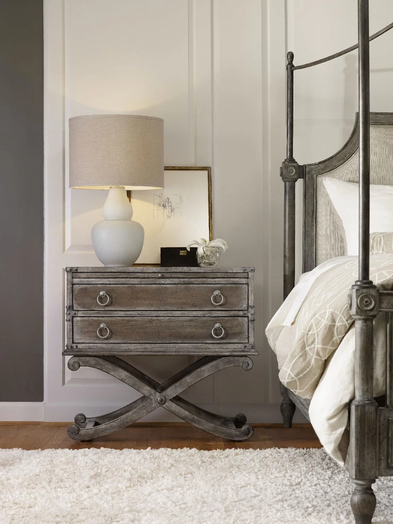 Inspired by vintage artifacts and classical motifs, the True Vintage Nightstand is a bold expression of the feminine heart and home. Offering two drawers with a pull-out writing surface and a FC707 3-plug outlet with USB port and a clip for a phone cord, this distinctive nightstand has an elegantly-aged, soft driftwood-tone finish with whitewash paint and custom-designed antique silver hardware. A bold expression of the feminine heart and home, True Vintage is a transformational collection inspired by vintage artifacts and classical motifs.