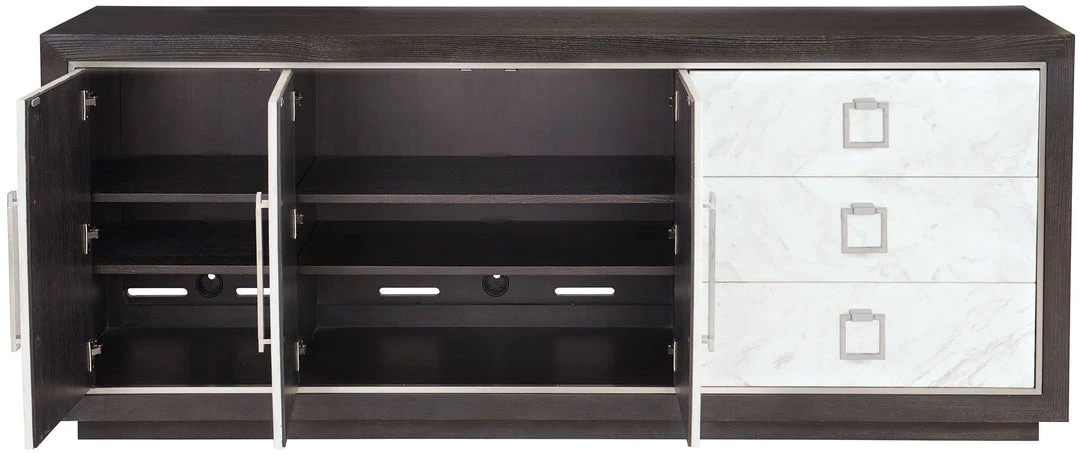 - Behind paired center/right doors are two adjustable/removable shelves, ventilation holes and one covered grommet hole in back panel.