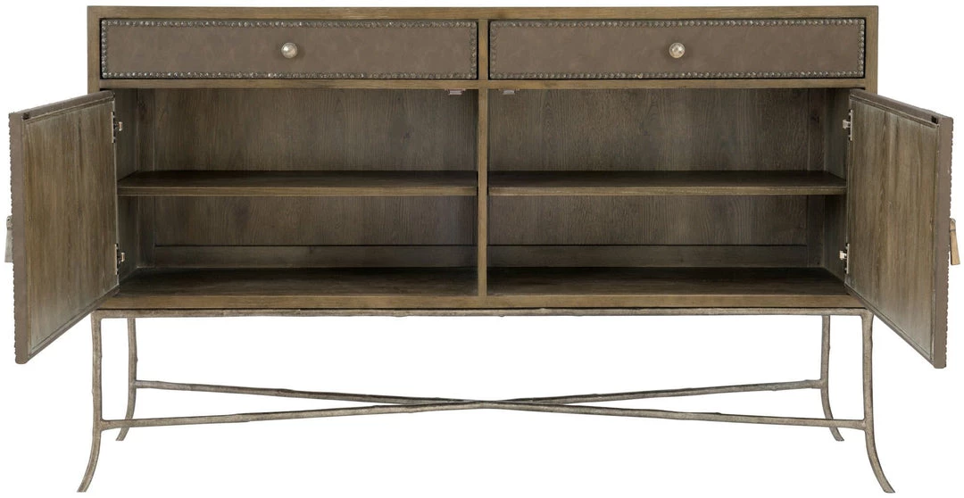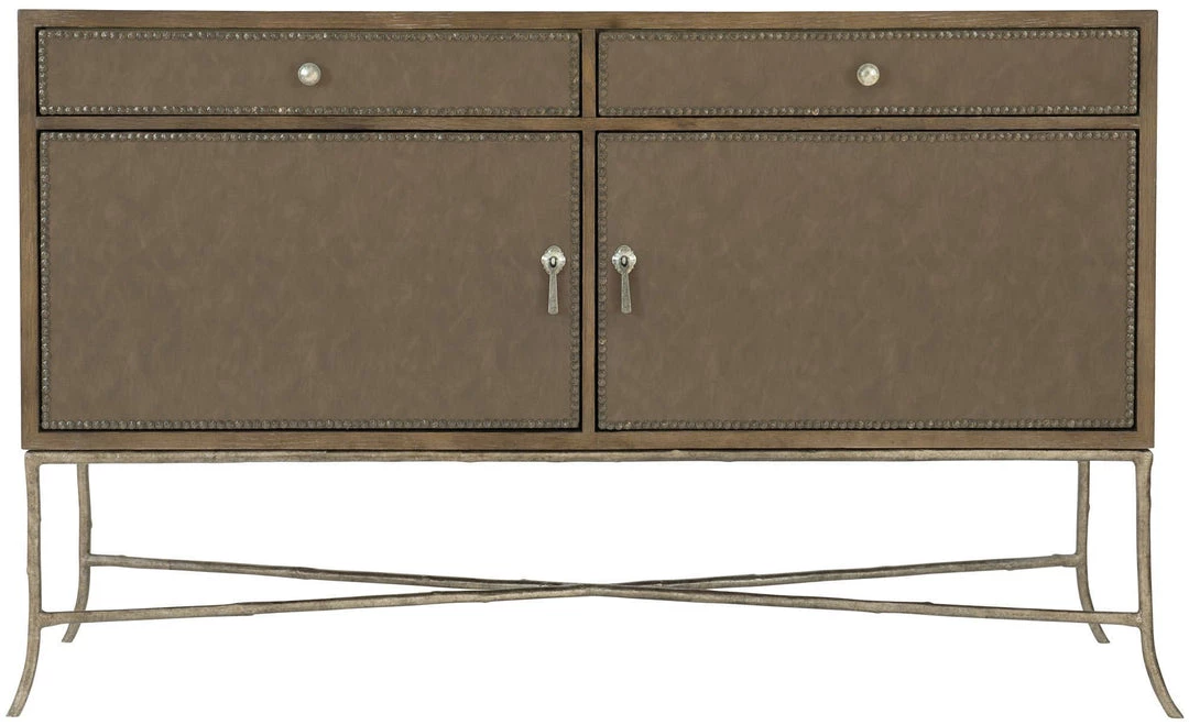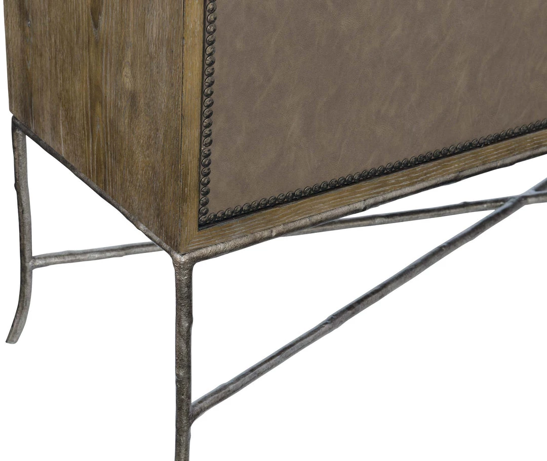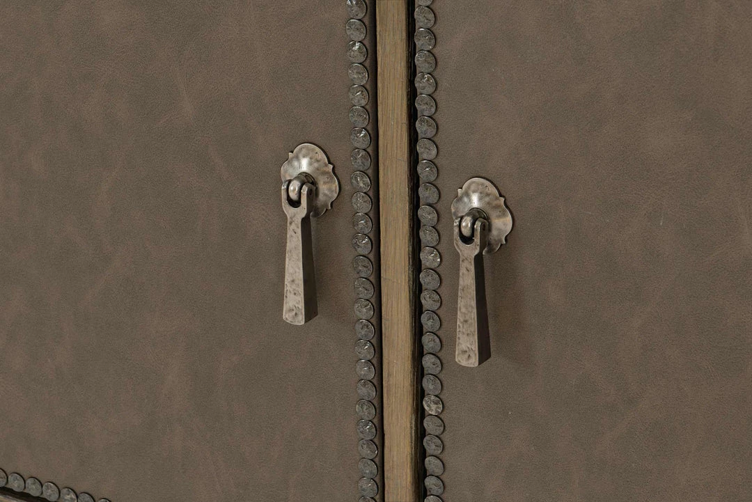- Two drawers and two doors with performance fabric wrapped fronts with textured Black Nickel finish nail trim border