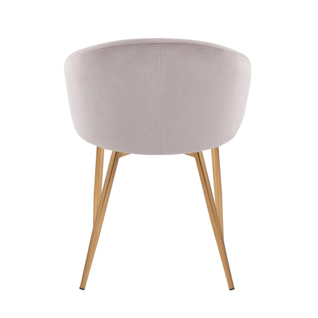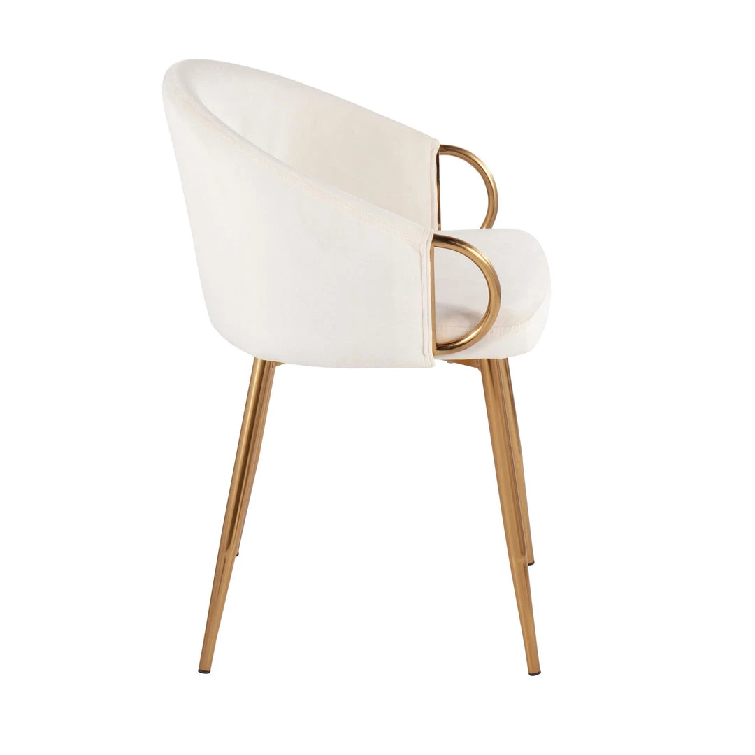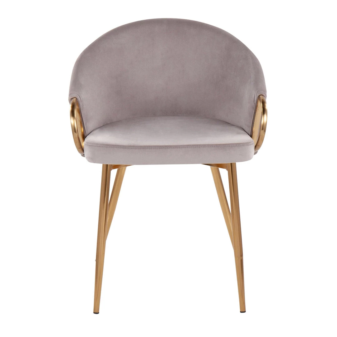 Chic modern style shines bright with the unique design of the Claire Chair by LumiSource. With a rounded low backrest, sleek gold armrests and a gold metal frame, it’s the perfect piece for your contemporary dining area. The Claire Chair is upholstered in lush velvet and available in various bold colors.