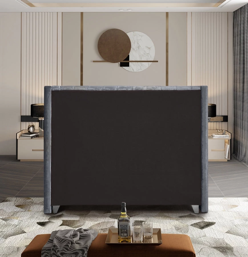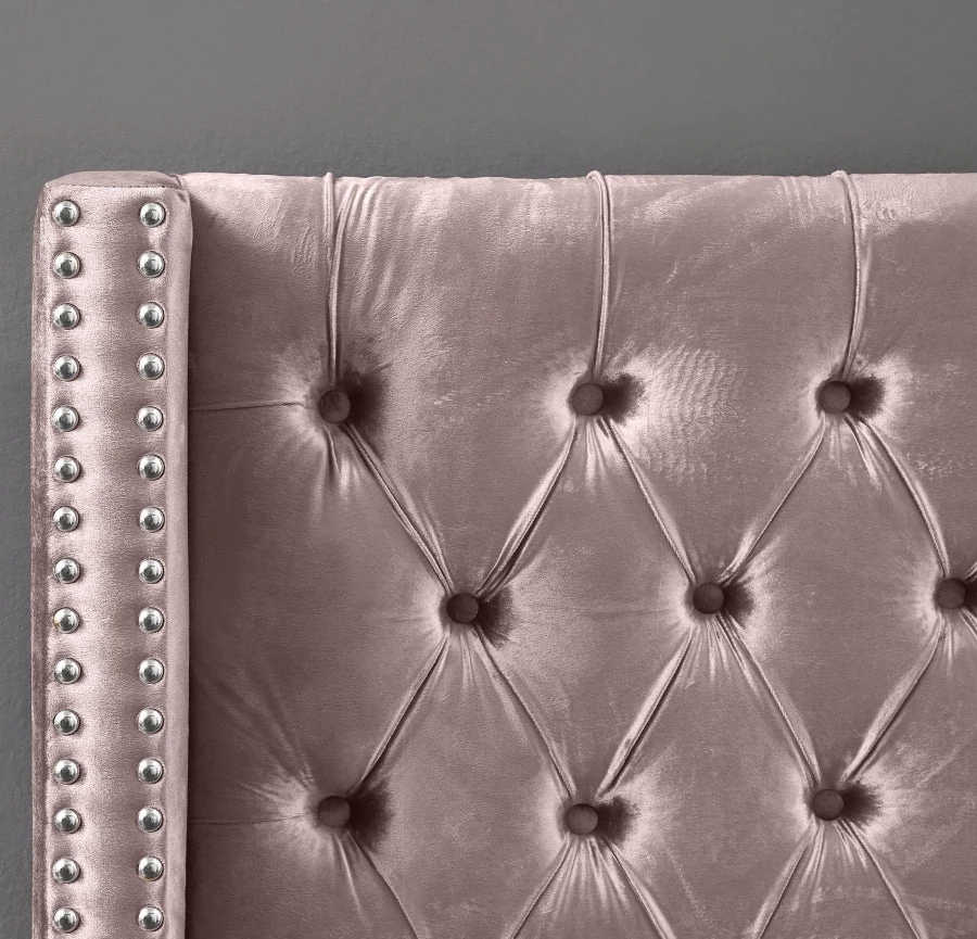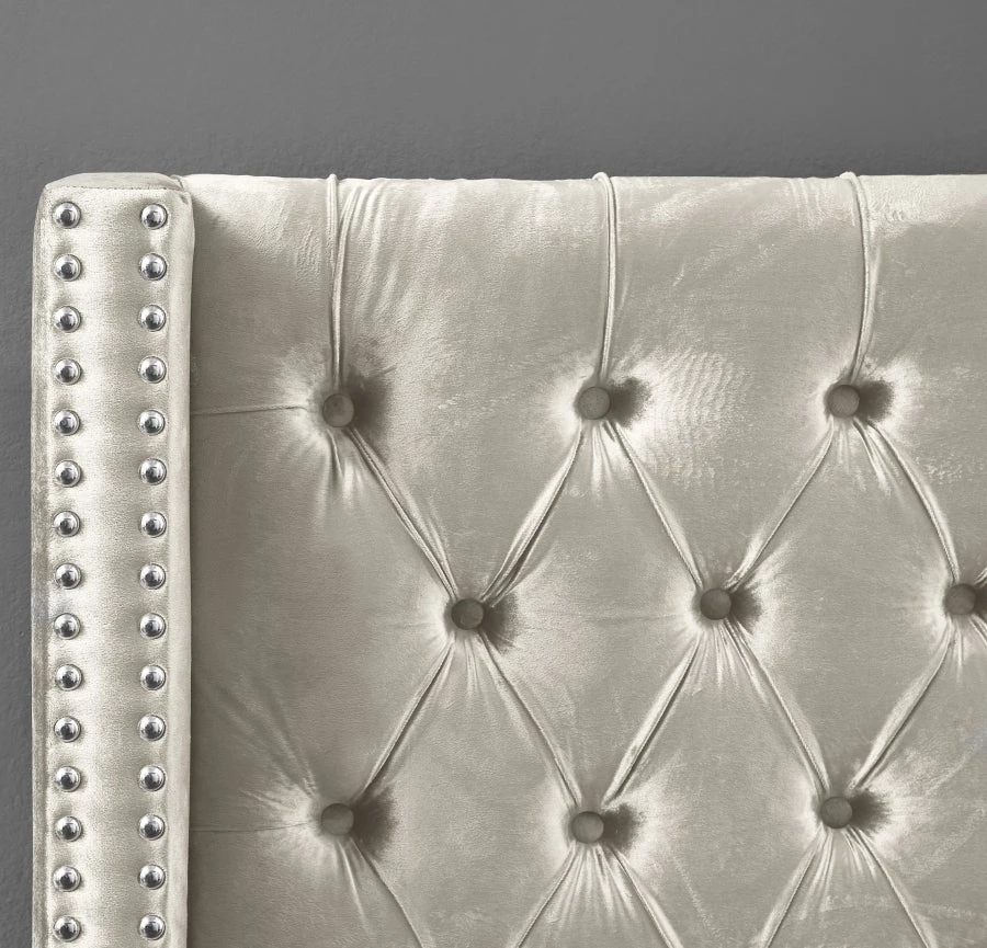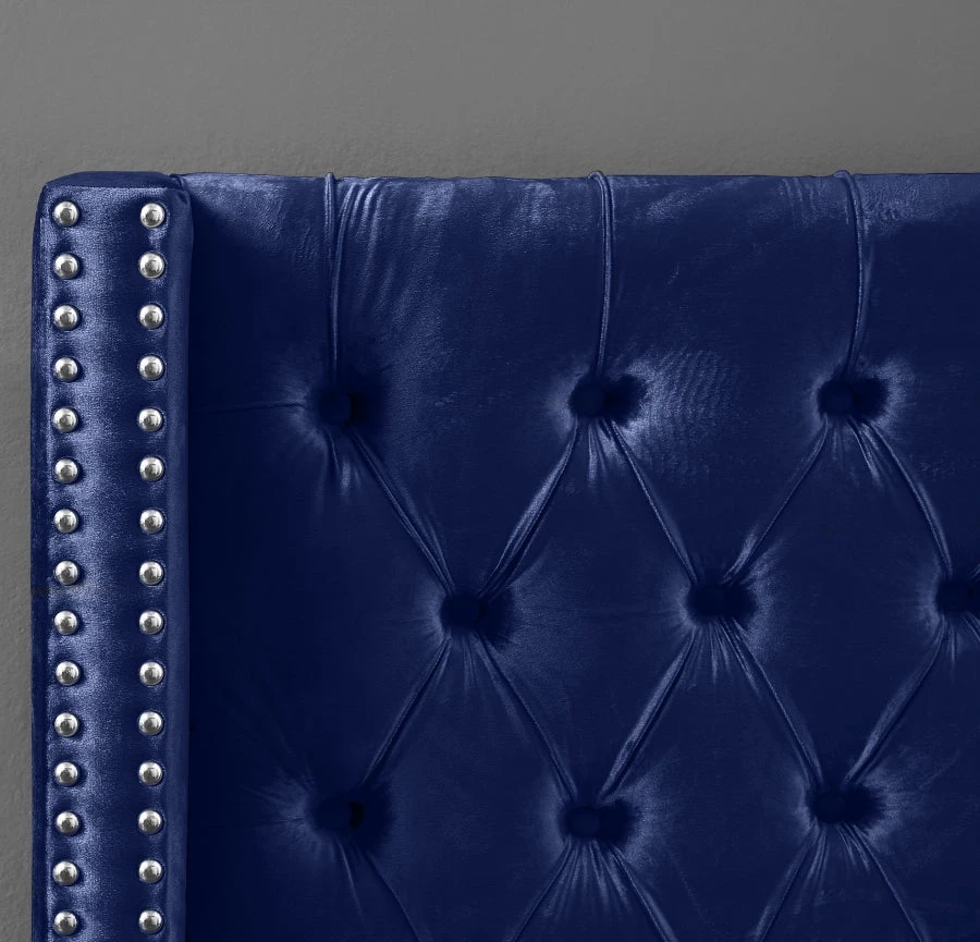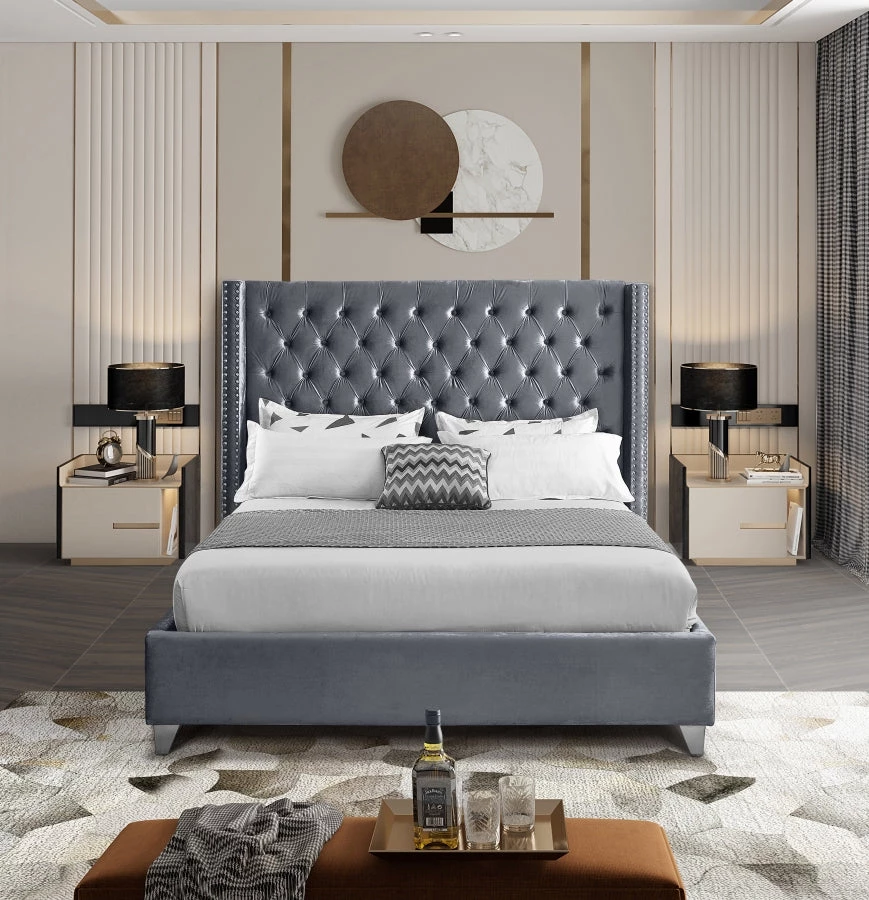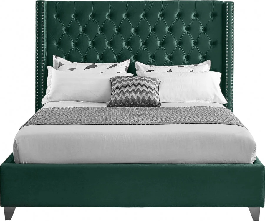 Elegant and eye-catching, the stunning Aiden Bed from Meridian Furniture is the perfect addition to any bedroom. Rich velvet covers the deep tufted design. A beautiful wing bed design is complimented by hand applied chrome nail head details. Strength and beauty is guaranteed with a solid wood frame and stainless steel legs.