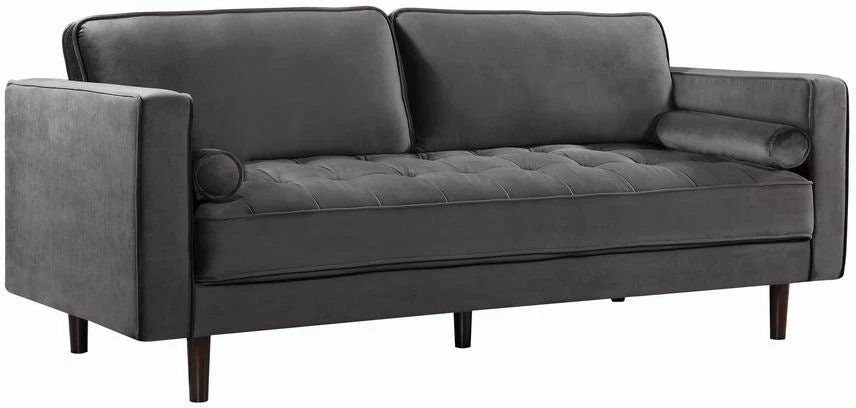 Stretch out and relax on this handsome Emily sofa. This Meridian Furniture sofa features wooden legs and a sturdy frame, so it’s built for the long haul. Its vibrant green velvet upholstery is a jewel tone that’s simply stunning and that adds a pop of color to your day. The sofa’s back cushions are plump and filled with premium material to cradle you in comfort, and it comes with two roll-style pillows for helping you prop up and unwind.
