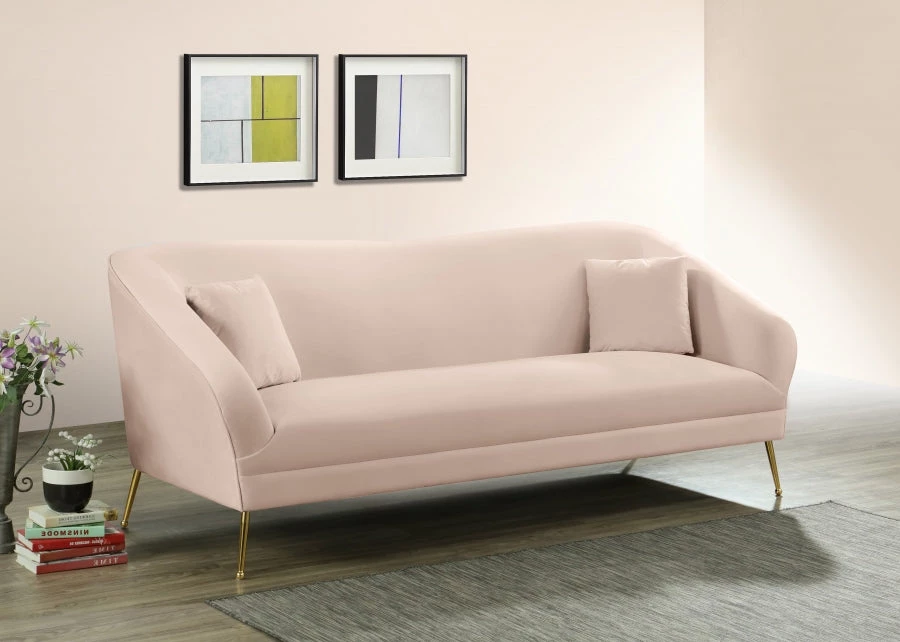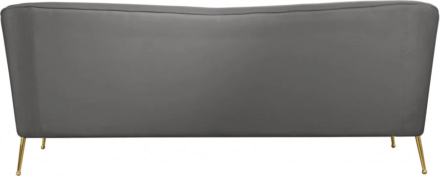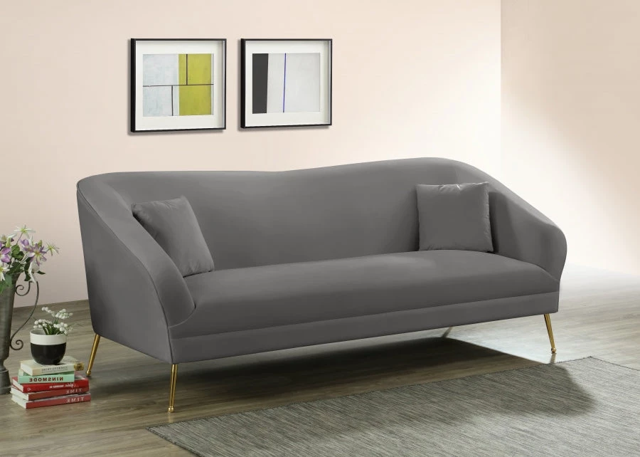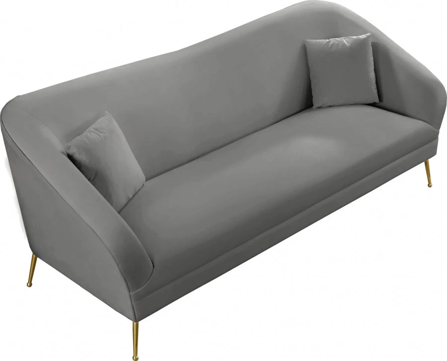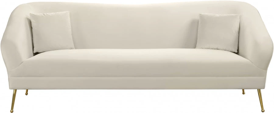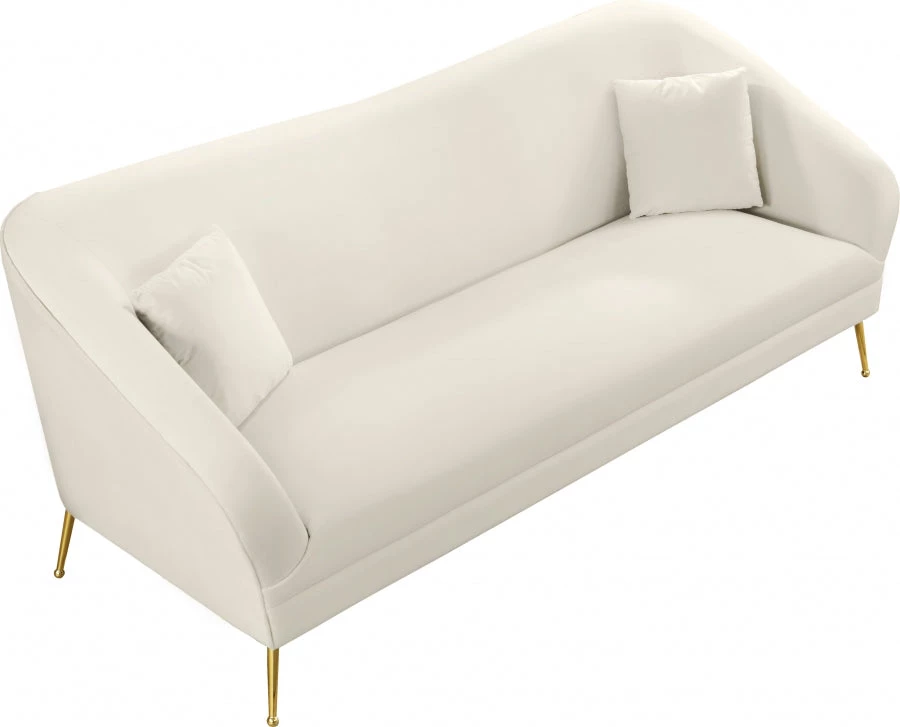 Create instant drama in your room with this Hermosa Velvet Sofa by Meridian Furniture. The mid-century design makes the sofa a true standout among other furnishings, with its sleek curved back and arms that create an aesthetically pleasing silhouette. The soft cream velvet upholstery feels sleek and sumptuous to the skin and gives your room an upscale look. Gold legs finish off the design, each of them with a ball design on the foot for added sophistication.