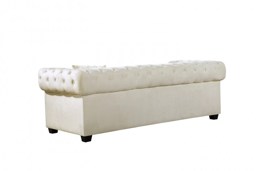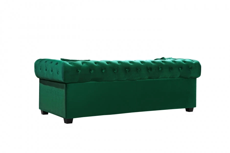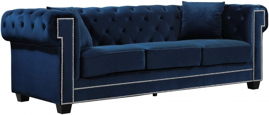 The Bowery Collection by Meridian Furniture. Features beautifully designed tufted velvet upholstery with custom wood legs and a nail head trim. This collection is guaranteed to be the highlight of any home. Throw pillows included.