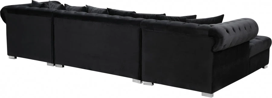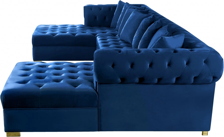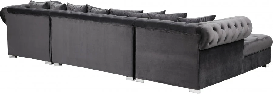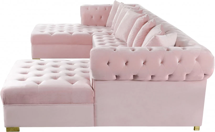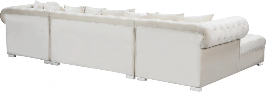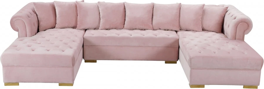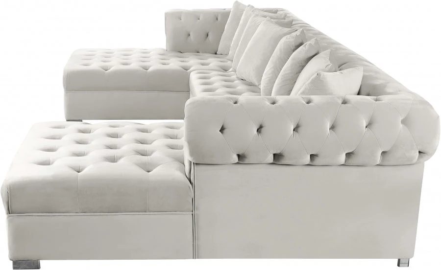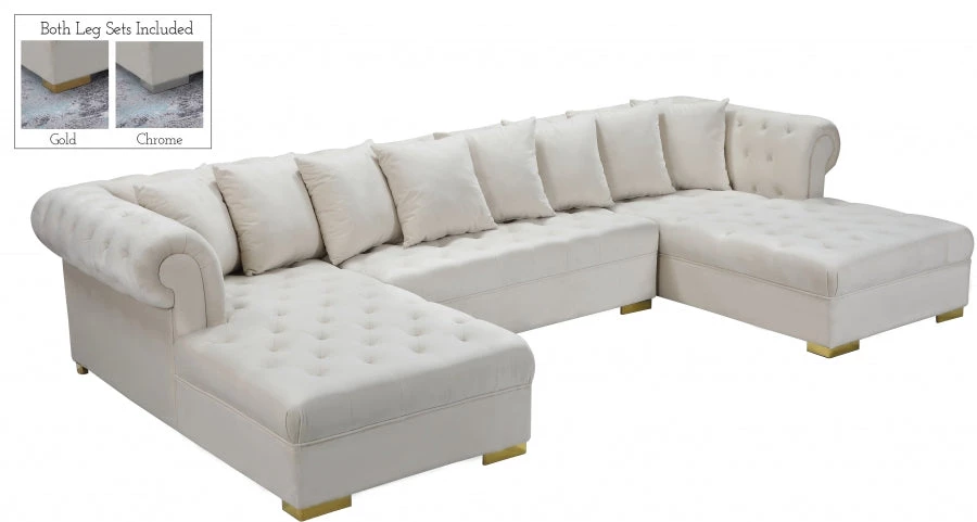 Get ready to relax after a long day with this Presley Cream, Grey, Black, Navy, Pink Velvet 3pc. Sectional from Meridian Furniture. Featuring rich cream velvet upholstery with deep tufting and comfy pillows, this double chaise sectional provides a luxurious, cozy space to kick back and watch TV, take a nap, or curl up with a nice book. Complete sets of gold and chrome legs complement your contemporary home decor while providing solid support for the sectional’s frame.