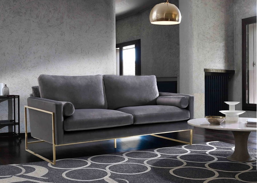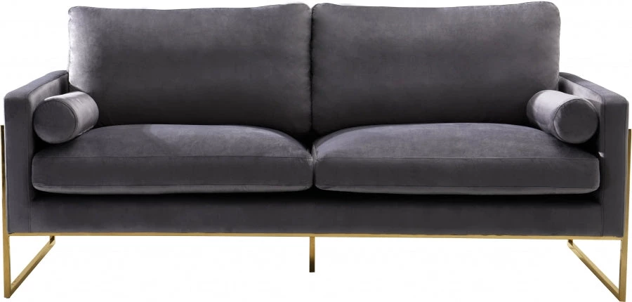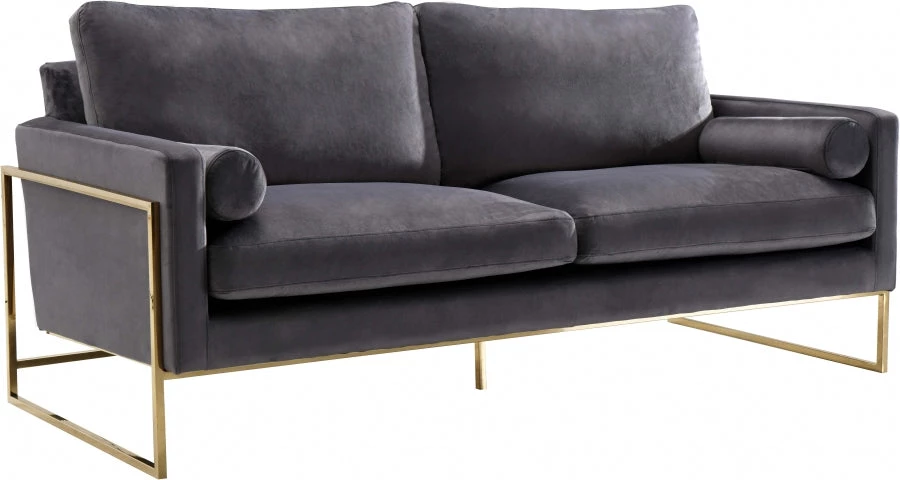 Seat guests in complete luxury on the Mila Grey Velvet Sofa. The bold grey color makes a statement in your space, and the gold stainless steel frame ensures sturdy support while you relax or take a nap. It comes with two throw pillows that cradle your sides as you sit, elevating its comfort level. Lots of clearance beneath this sofa makes cleaning and vacuuming a breeze. Buy it alone or pair it with the matching loveseat or chair!