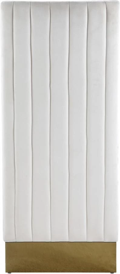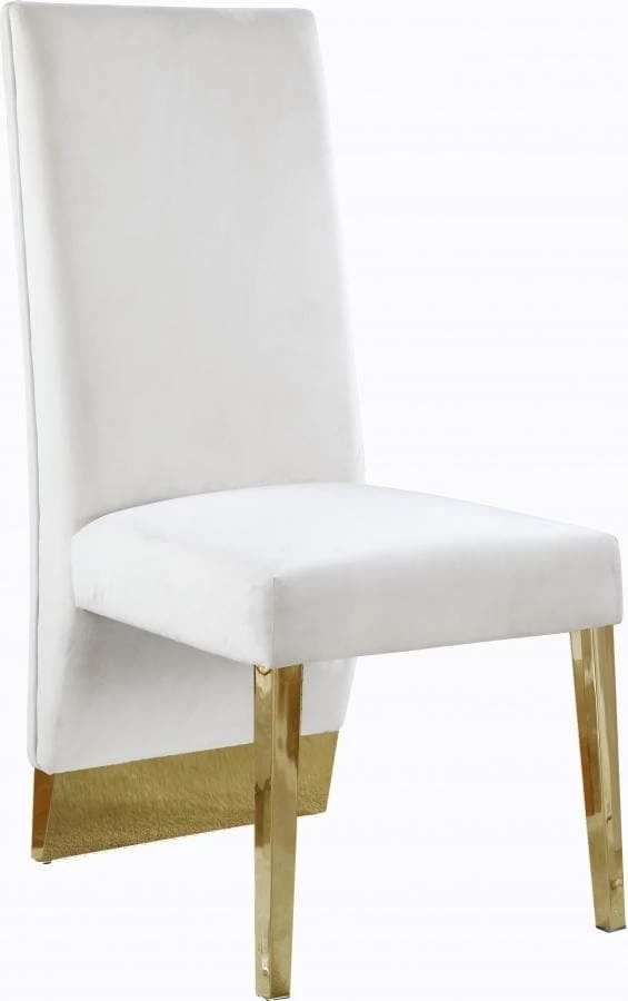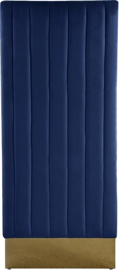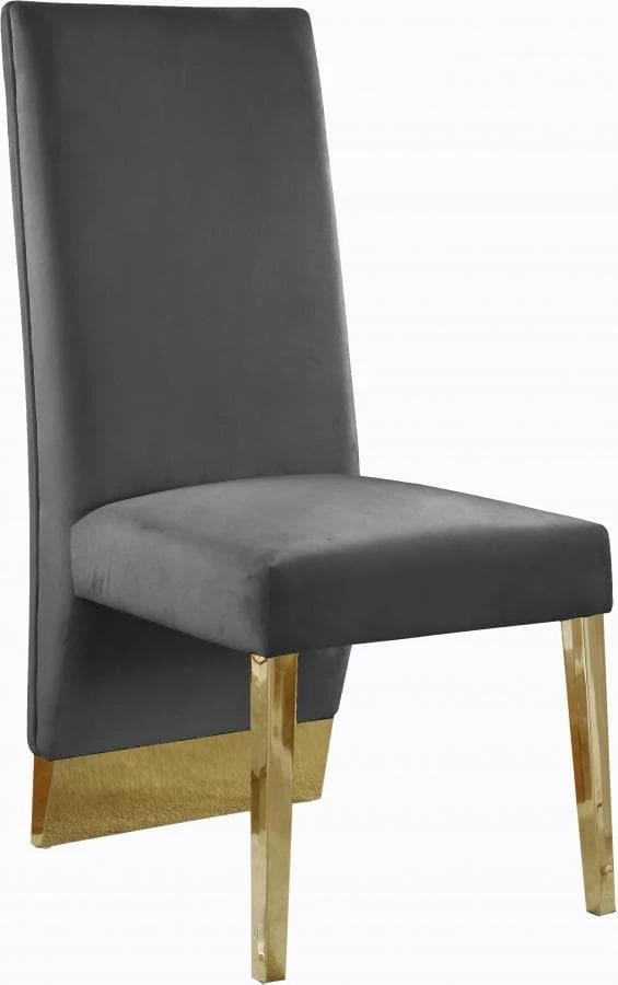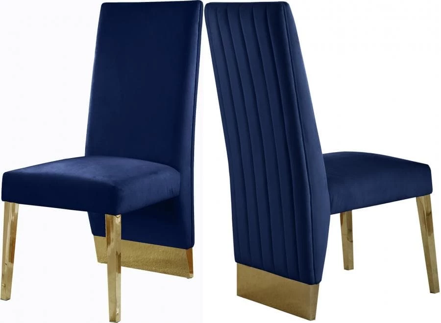 Bring the luxe look of this Porsha chair to your dining space. Impressing guests is simple when they’re seated in this chair. The floor-length back is elegantly beautiful and creates a striking silhouette from every angle. Velvet upholstery material in a sophisticated hue of navy adds a touch of modernity to this chair, and the reverse is channel tufted for added elegance and refinement. Gold legs complete the look for added contemporary panache and sturdy support.