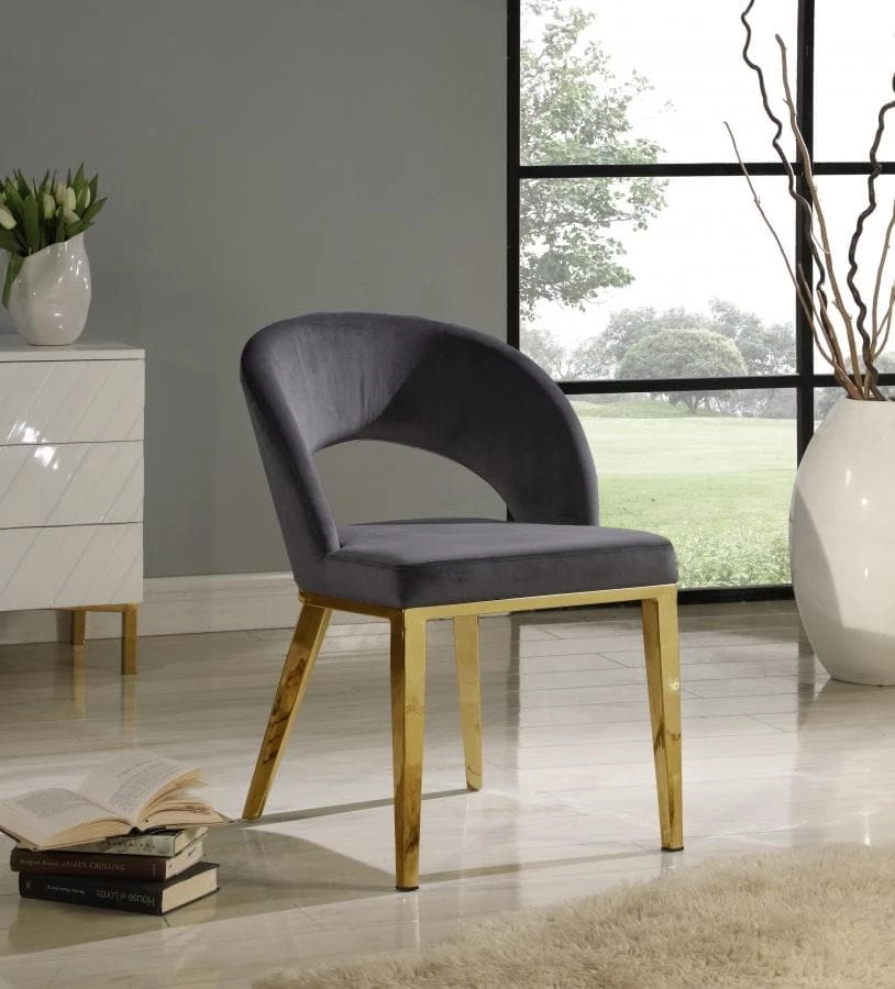 Seat dinner guests in elegant style with the Roberto black velvet dining chair from Meridian Furniture. This fabulous chair features a rounded back with strategically placed opening for visual beauty and to allow air flow while you dine. The rich black upholstery is chic and modern, and it has a soft feel against the skin. This chair rests on iron legs for superb support, and each leg is finished in gold for a modish slant that meshes well with your up-to-the-minute dining room decor.