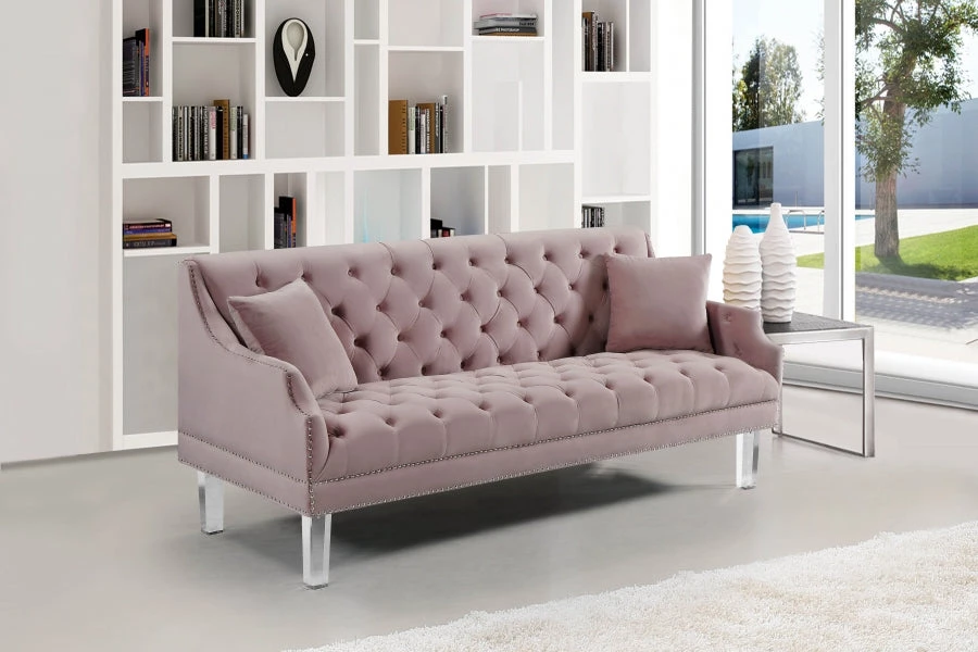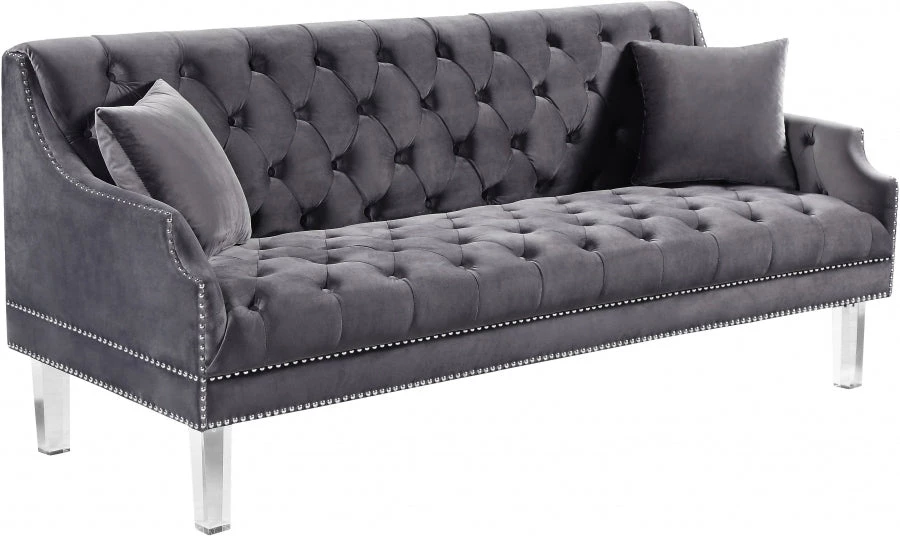 Bring a posh look home with this Roxy Grey Velvet Sofa. The velvet is both striking yet unobtrusive, giving your room an elegant style boost while providing you with a comfortable spot to sit and relax while reading or watching TV. Deep button tufting gives the sofa a touch of texture while ensuring its sophistication is lost on no one. Add this contemporary sofa on its own to your living room or den, or buy it alongside the coordinating loveseat and chair for a complete and total makeover.