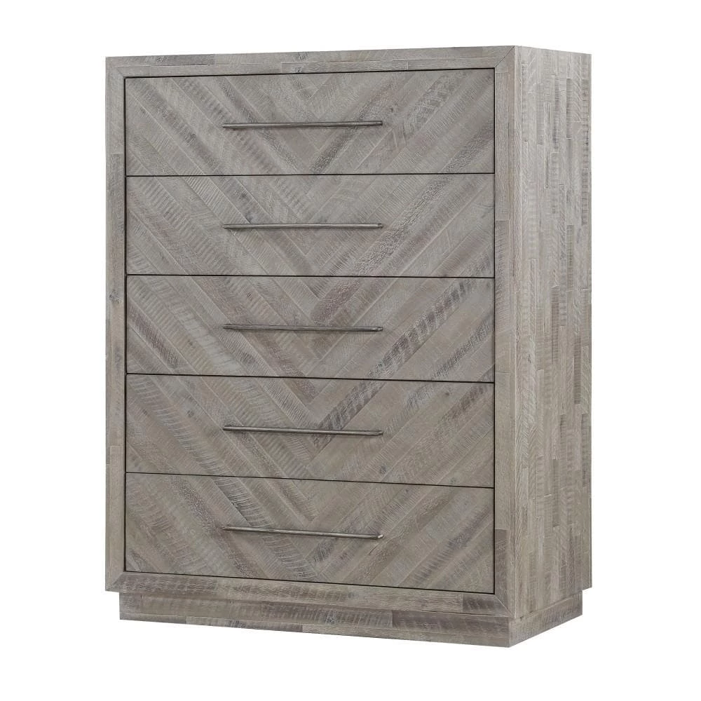 Rustic and contemporary. The Alexandra chest’s appeal comes from the roughhewn Acacia used in its creation. Hand-selected planks of solid wood are carefully sanded, stained and whitewashed for a driftwood appeal that accentuates the active grain and draws out natural knots and markings from the milling process. They are then inlaid over plywood to create a handsome herringbone pattern and finished with thin metal bar pulls for the crowning contemporary touch.