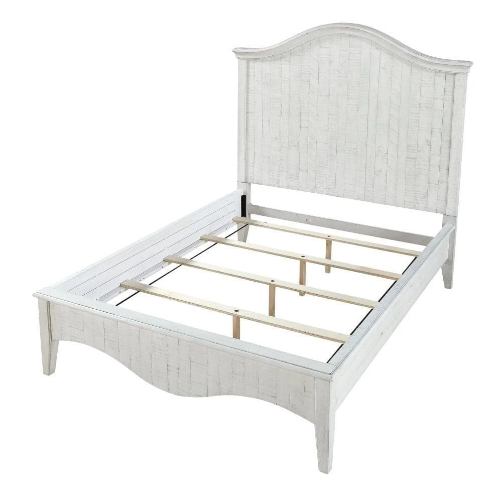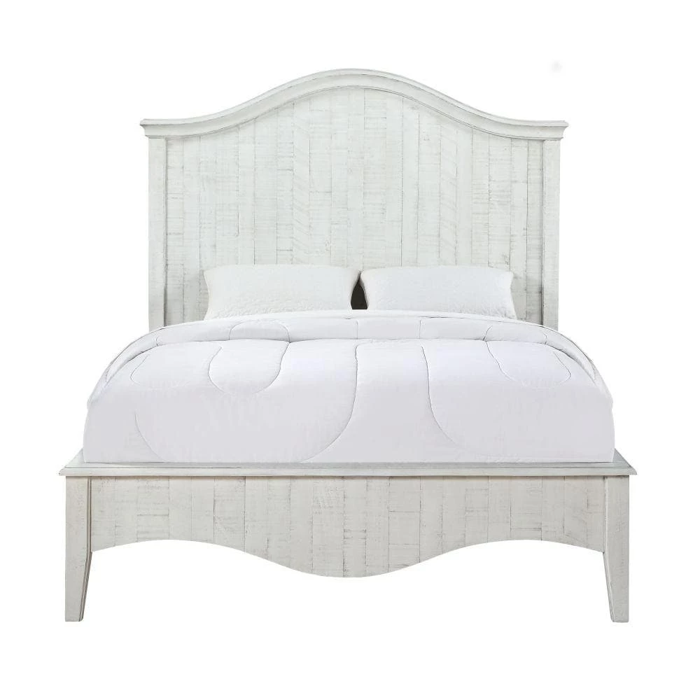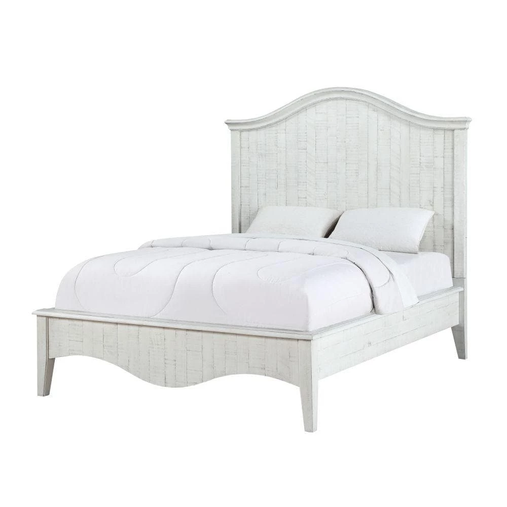 Rustic detail. With its chic, scalloped edges and weathered White Wash finish, the Ella collection transforms the bedroom into a romantic retreat. Planks of solid wood feature unique texture, knot and grain patterns that boost the rustic appeal of each piece, while angled feet and contrasting oil rubbed bronze drawer pulls make an instant style statement.