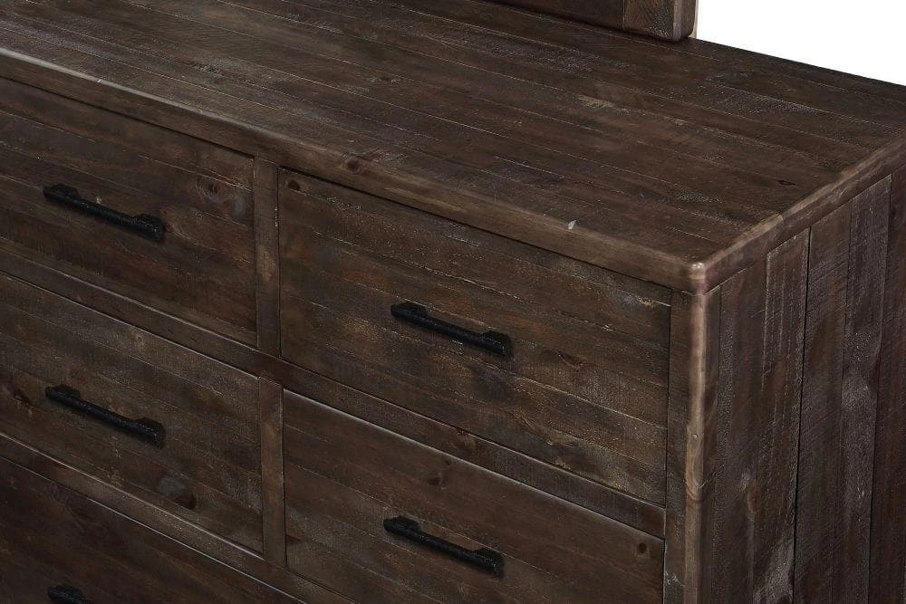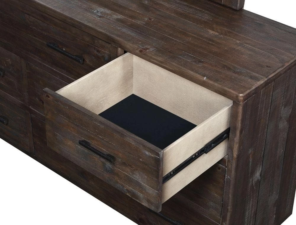 McKinney’s instinctive good looks come from naturally rough-hewn surfaces that are specially treated to accentuate the wood grain, then softened with unique bullnose edging. Asymmetrical dresser drawers and open storage in the nightstand and platform bed add delightful versatility. Available in an Espresso Pine finish