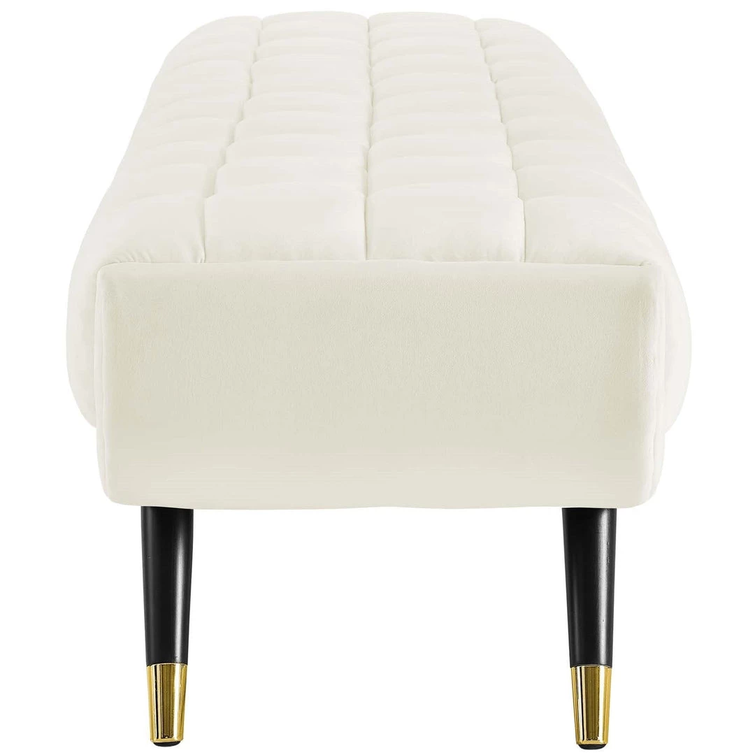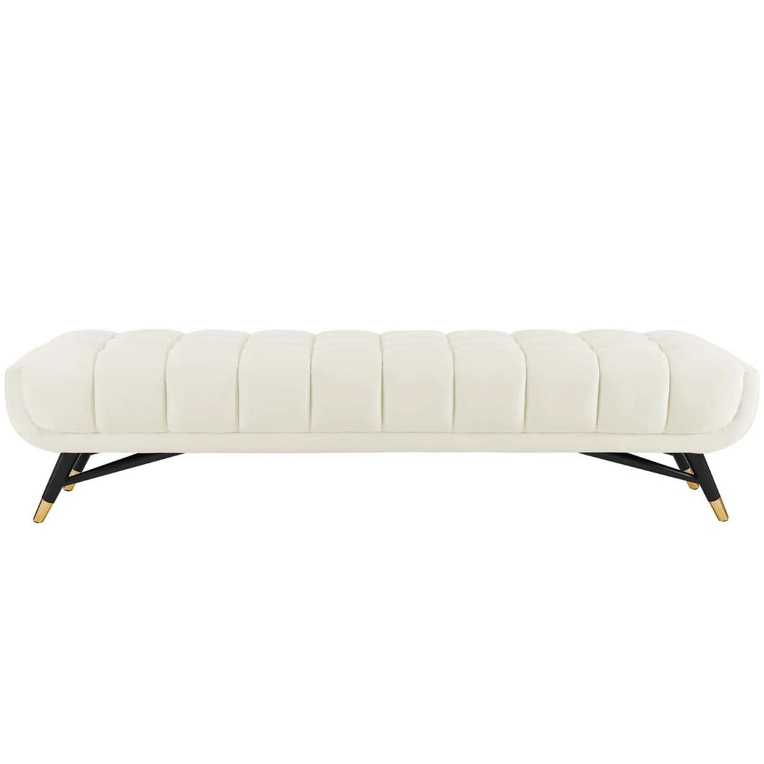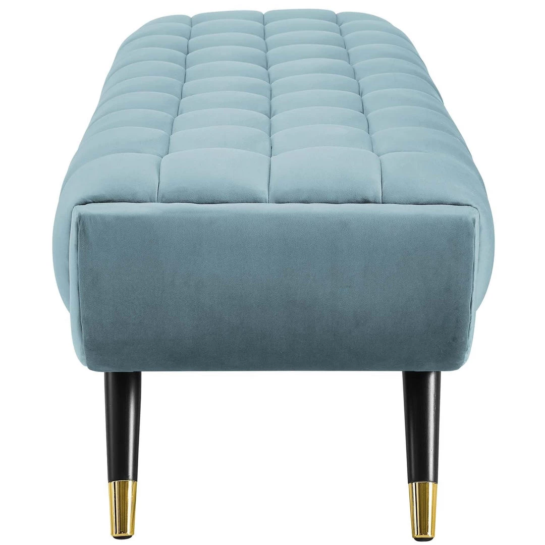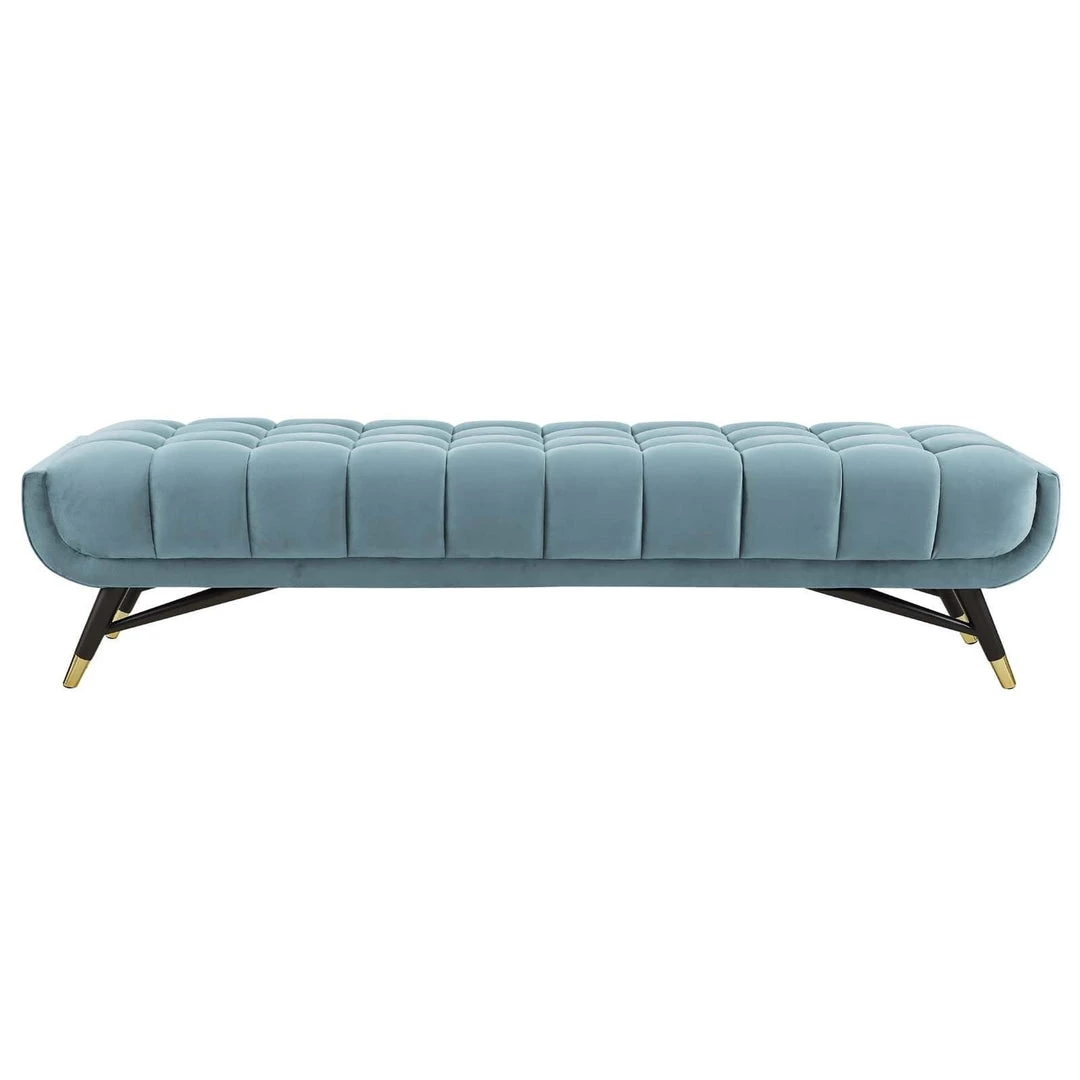 Embolden your living room décor with Adept Performance Velvet Accent Bench. Featuring a blend of chic, contemporary, and mid-century modern design, Adept’s broad profile, generous tufting, stain-resistant performance velvet polyester upholstery, and subtle metal accents imbue rich detail and chic sophistication. Kick back and enjoy the plush comfort of the Adept bench while reading your favorite book or lounging with friends and family. Resting atop a splayed black birchwood frame with gold metal end caps, Adept is a striking addition to the home or apartment.