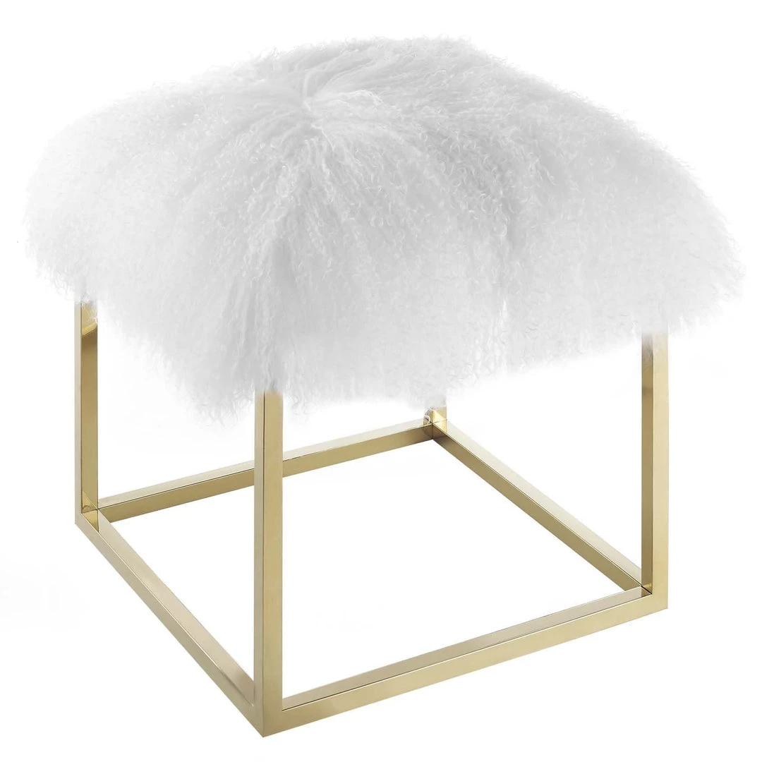Make a statement with Anticipate. Brimming with clean lines and a sleek modern look, Anticipate features a gold stainless steel base, foam padded seat upholstered in luxurious white sheepskin, and non-marking foot caps that help protect your flooring. The perfect addition to your bedroom, living space or entryway, Anticipate is a versatile ottoman that combines comfort and style with a supportive seat cushion and weight capacity up to 265 lbs.