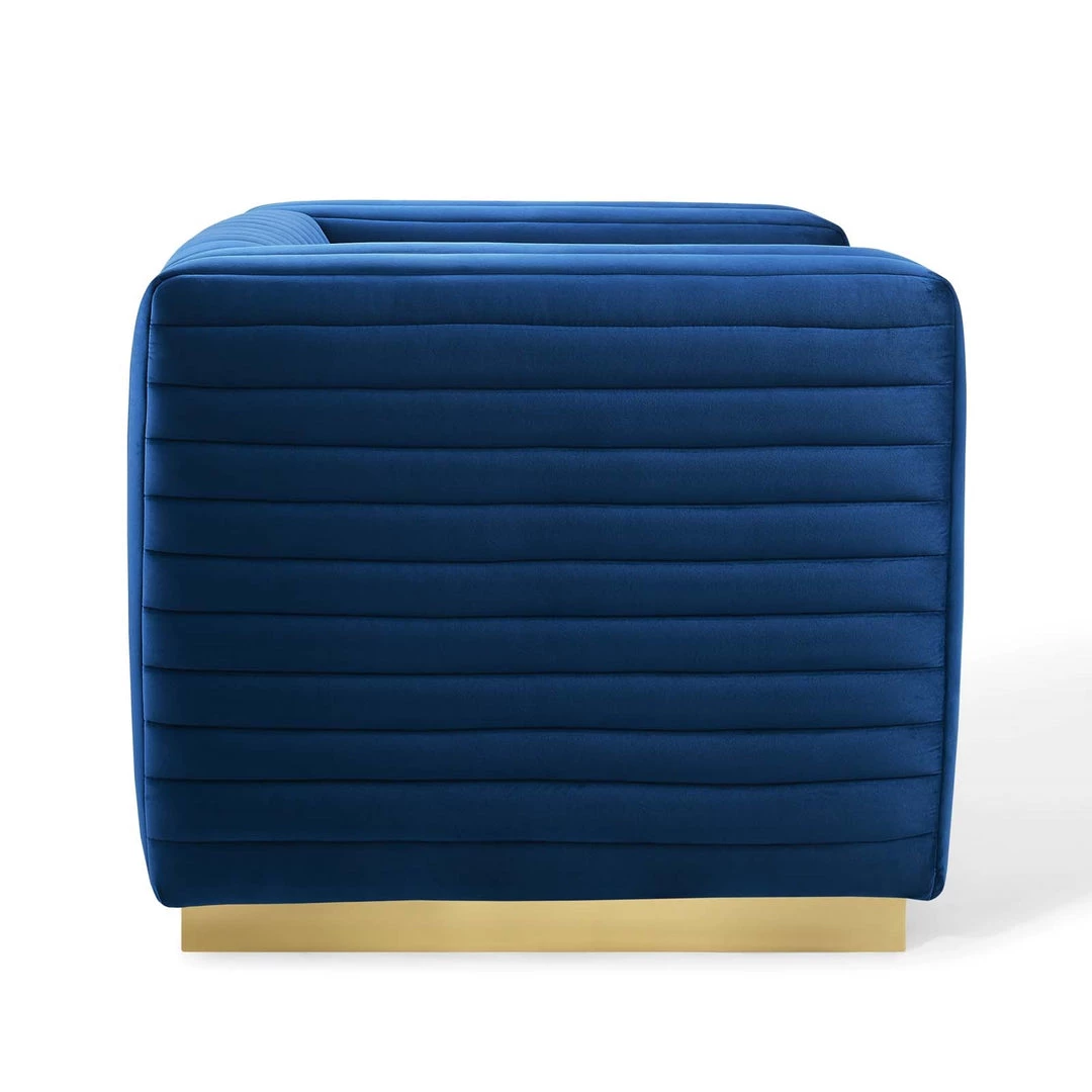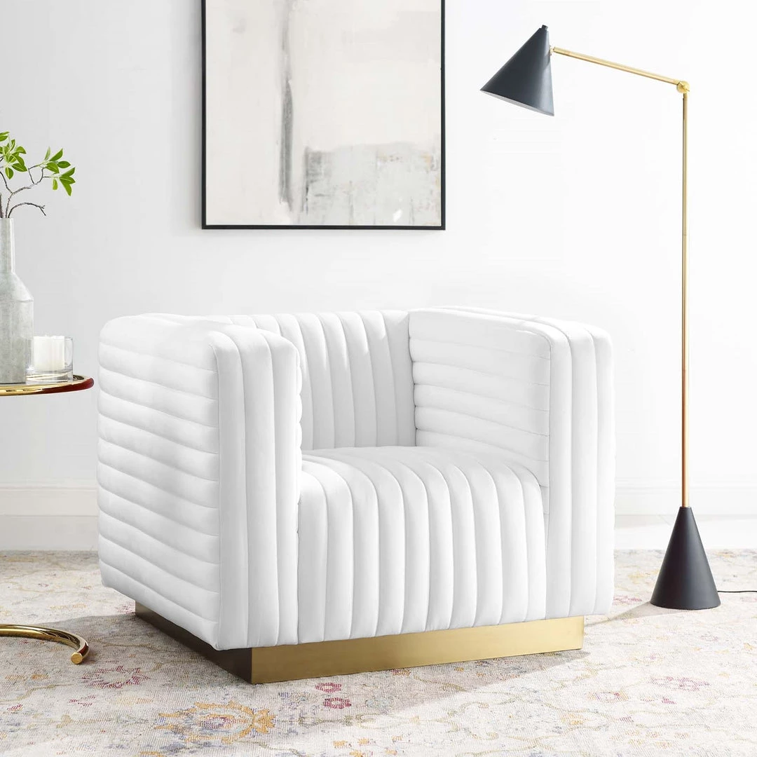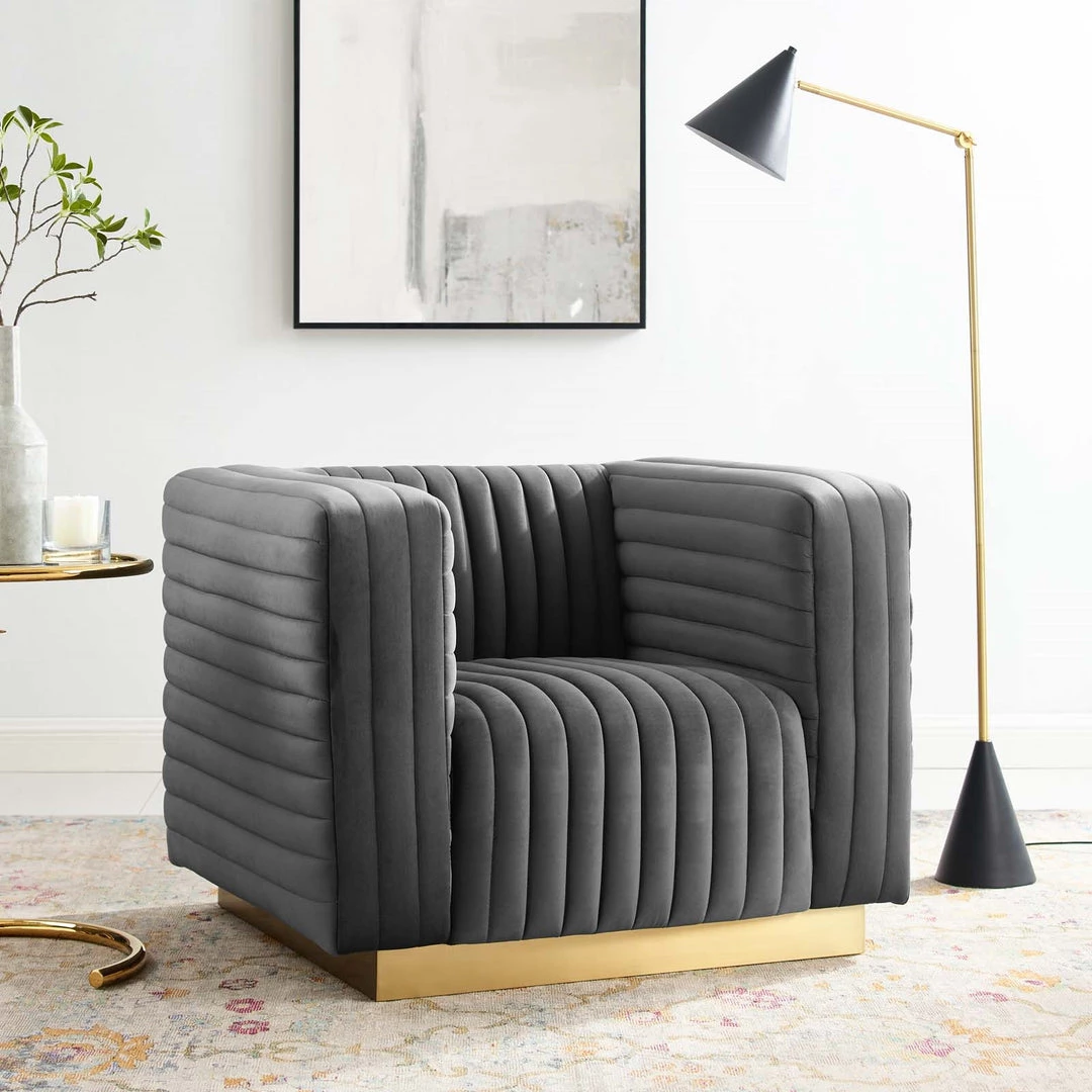 Charm exudes from the glam deco design of the Charisma Channel Tufted Performance Velvet Lounge Accent Armchair. Recline and converse with Charismaβs soft and stain-resistant velvet polyester fabric covers dense foam padding with individually wrapped spring coil system for a supportive and luxurious living room chair. Softly rounded arms create an elegant embrace as the channel tufting details add visual depth and direction. Resting securely on a gold stainless steel base, Charisma Accent Chair adds retro modern style to your living room, lounge room, or office seating area. Chair Weight Capacity: 440 lbs. Comes Fully Assembled.