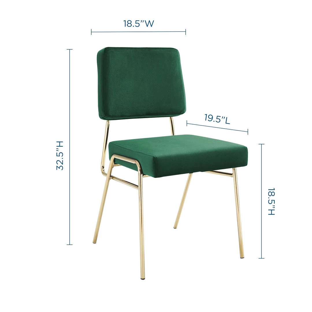 The blended aesthetics of mid-century modern style and the elegance of vintage glamour are channeled to create the striking Craft Performance Velvet Upholstered Dining Side Chair. Featuring dual densely padded foam cushions covered in soft and stain-resistant performance velvet polyester upholstery, this dining chair is a luxurious seating experience with an open, breathable design. The Craft Accent Chair sits on an eye-catching gold stainless steel frame with flared rear legs and non marking foot caps elevating your dining room, lounge room, and office decor. Chair Weight Capacity: 330 lbs. Comes Fully Assembled.