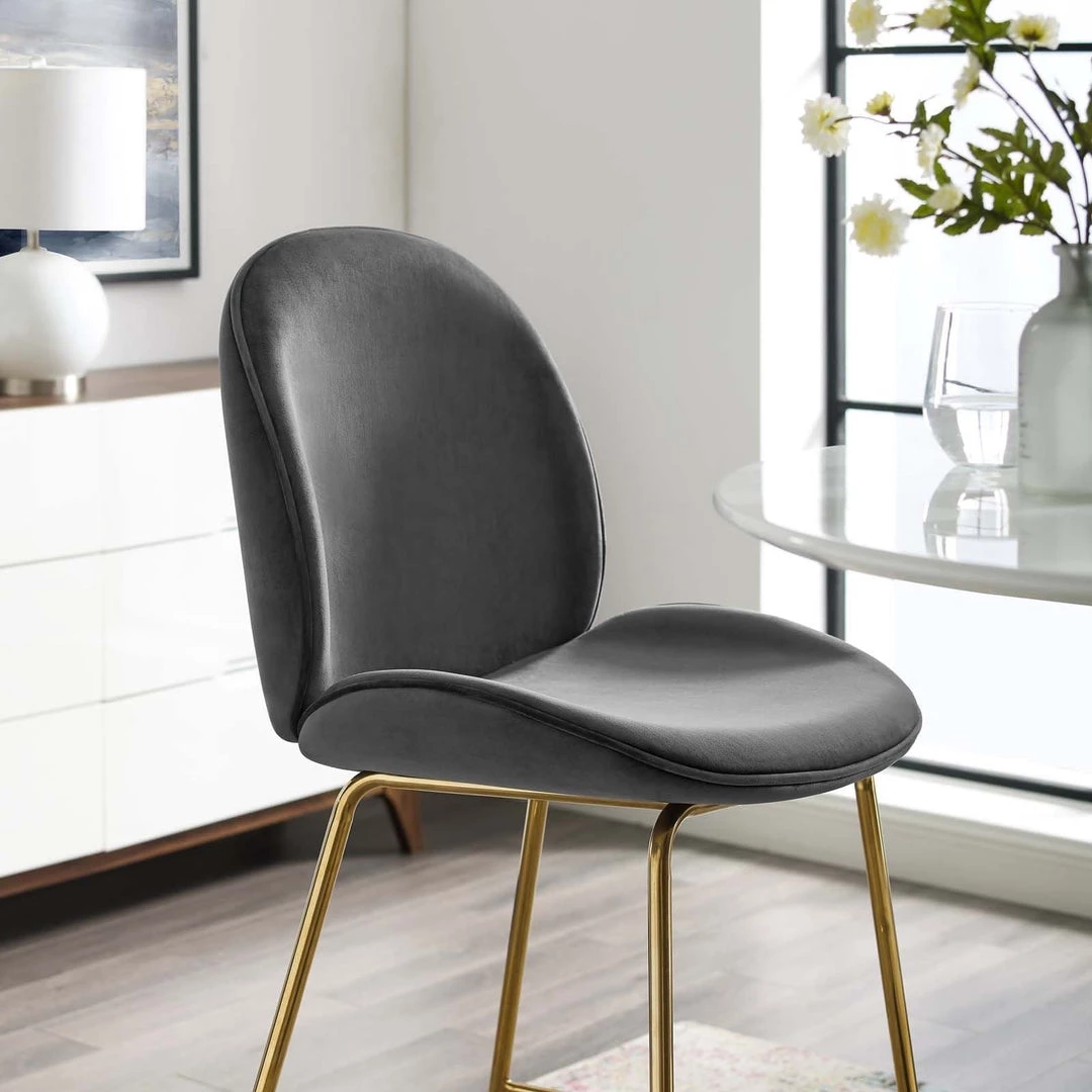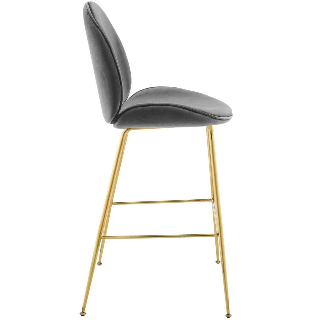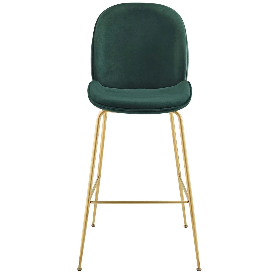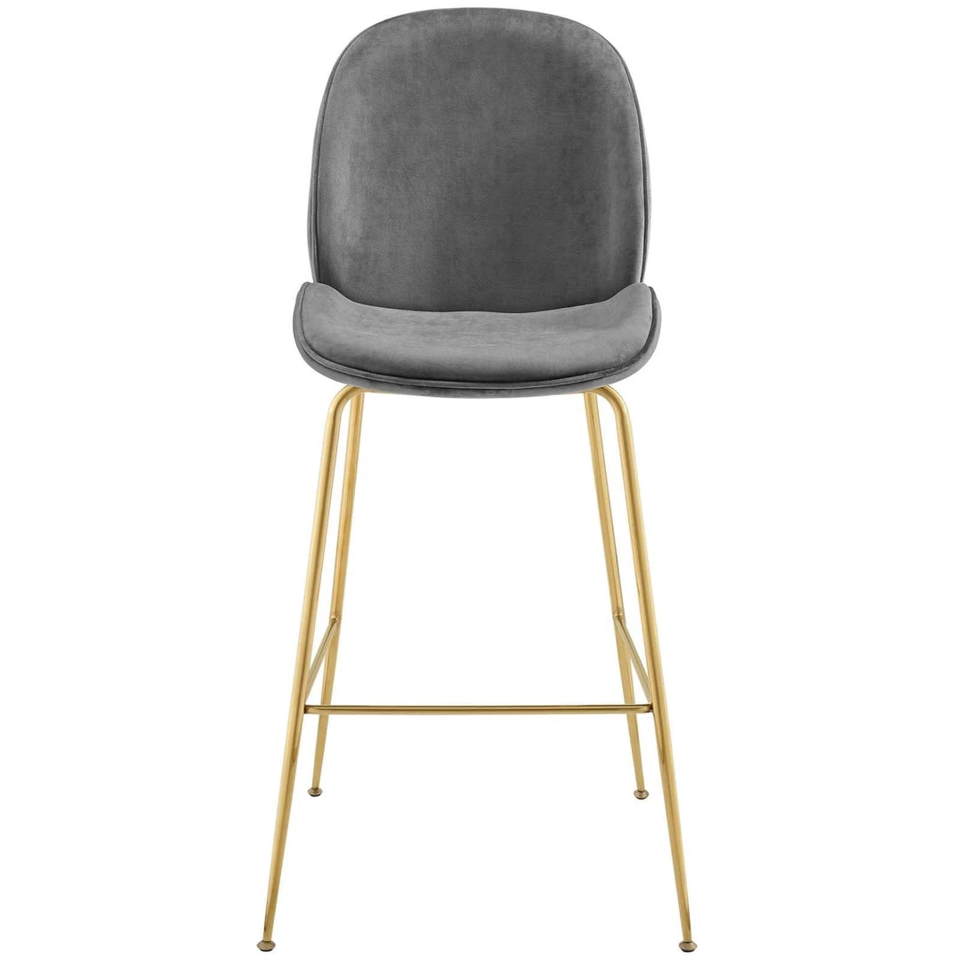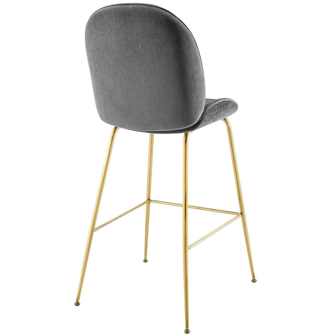 Breeze into vintage glamour decor with the whimsical Scoop bar stool. Supported by a splayed gold stainless steel frame, Scoop comes with a soft, stain-resistant performance velvet upholstery for a unique addition to your bar decor. Padded in dense foam, Scoop features simple curves and a sleek, minimalist frame that combine to deliver a modern bar stool perfect for all your pub height needs. Complete with a footrest and non-marking foot caps, transform your dining decor today with this cheerful and elegant pub height stool.