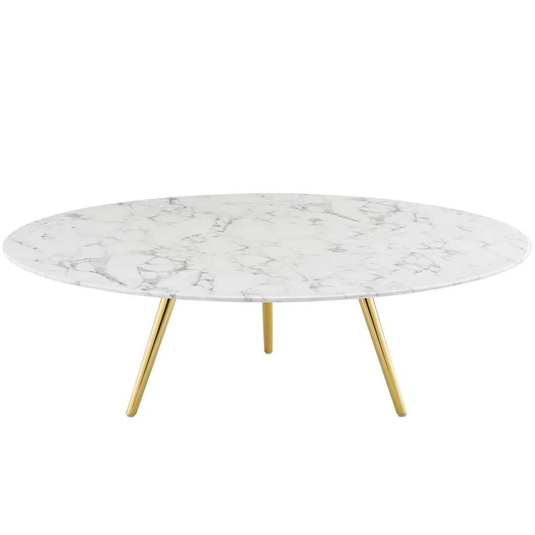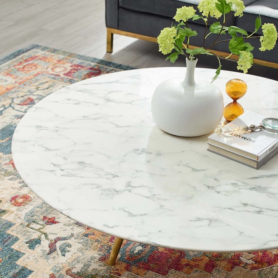 Reflecting a seamless organic shape and timeless form, the Lippa Table has become a symbol of modernism for over the past 60 years. Before its release, homes were filled with clunky remnants of an industrial age long gone by. But in order to advance into the new world, homes first had to transition from the traditional square table, into a piece that connoted progress. A twist on the original design, this coffee table features a round white faux marble table Top lacquered with a scratch-resistant finish and tripod base with tapered metallic gold dowel legs. This rendition of Lippa is a coffee table that’s perfect for the living room, lounge area, or home office.