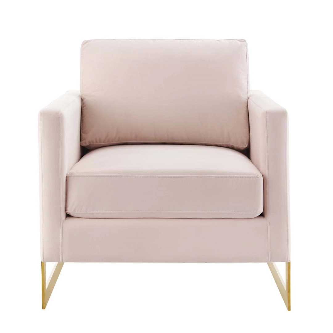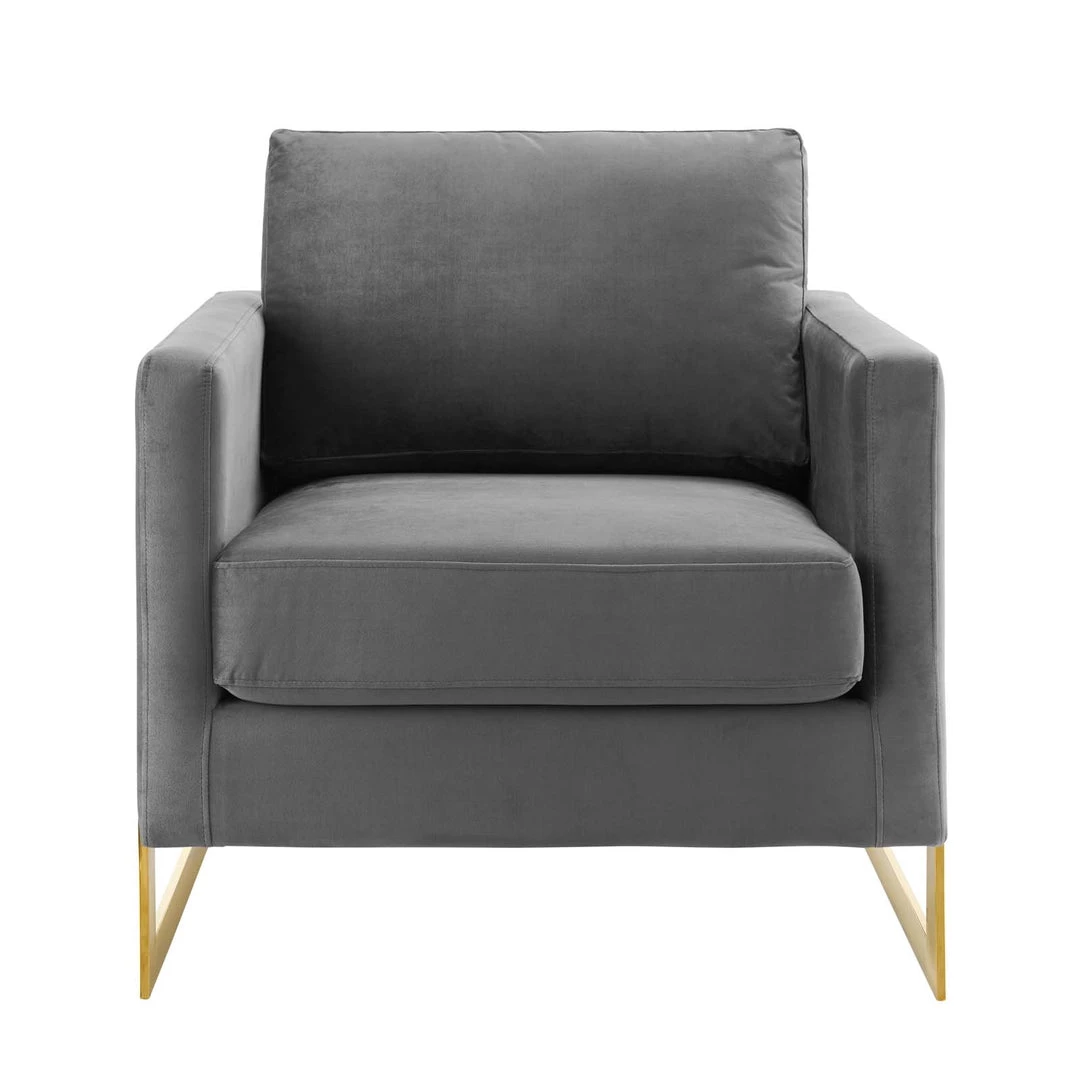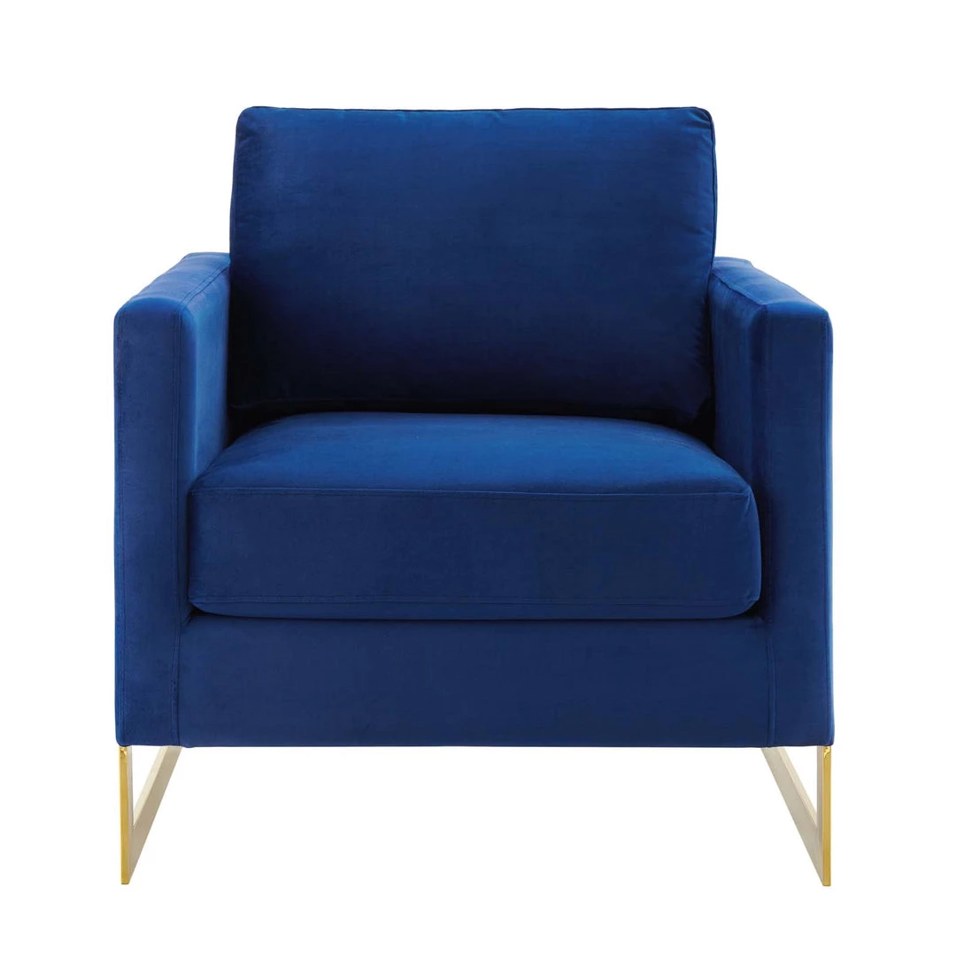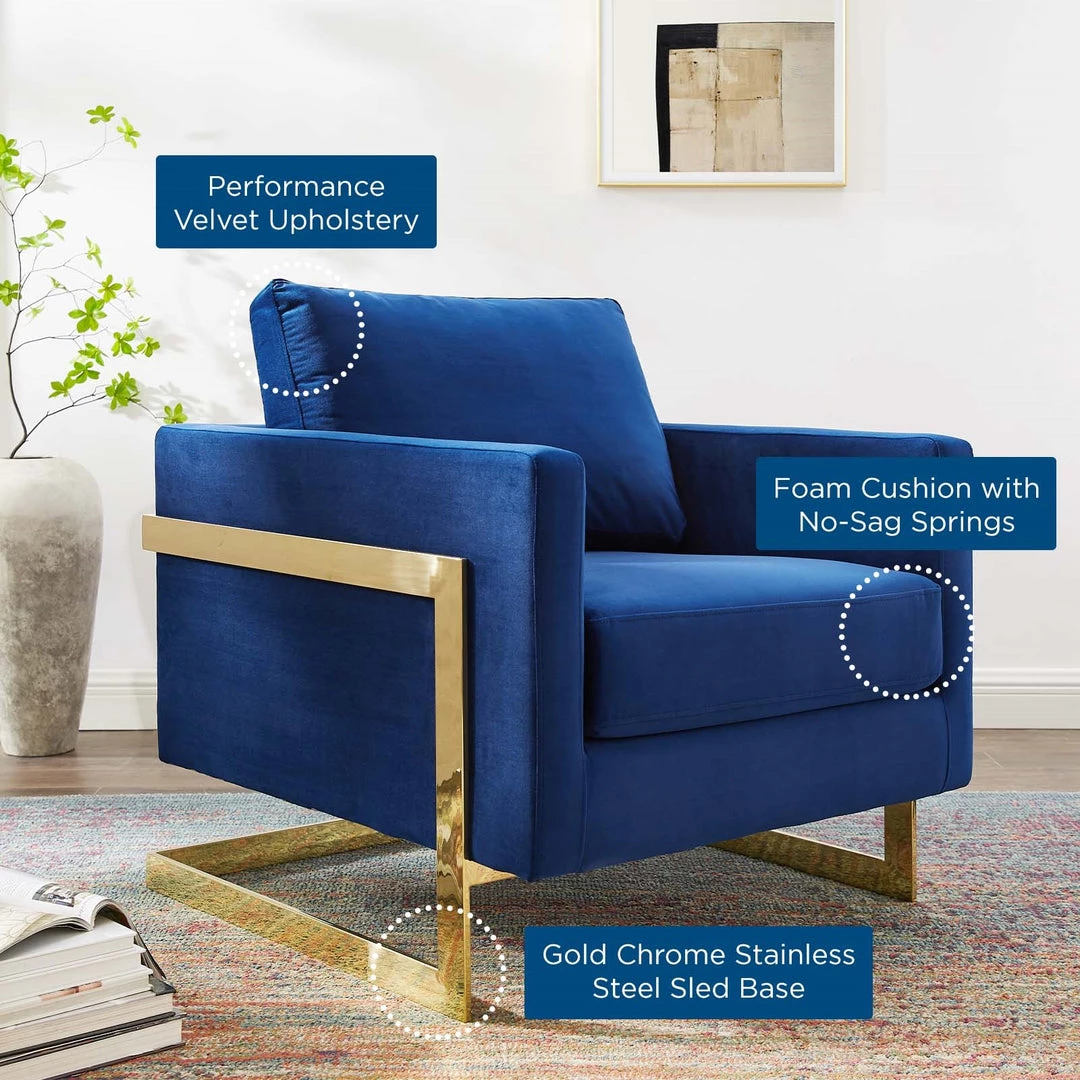 Welcome rich luxury and glam deco style to your living space with the Posse Performance Velvet Accent Chair. A striking addition to the living room, office, bedroom, or entryway, this armchair sits atop a gold chrome stainless steel sled base complete with squared edges and angular detail. Covered in soft, stain-resistant performance velvet, this upholstered armchair features dense foam padding over no-sag springs for a premium seating experience abounding in comfort and support. This velvet chair is perfect for offices looking to impress new clients and for anyone intrigued by retro modern designs that develop space and form in an innovative way. Includes non-marking foot pins. Assembly Not Required. Weight Capacity: 300 lbs.