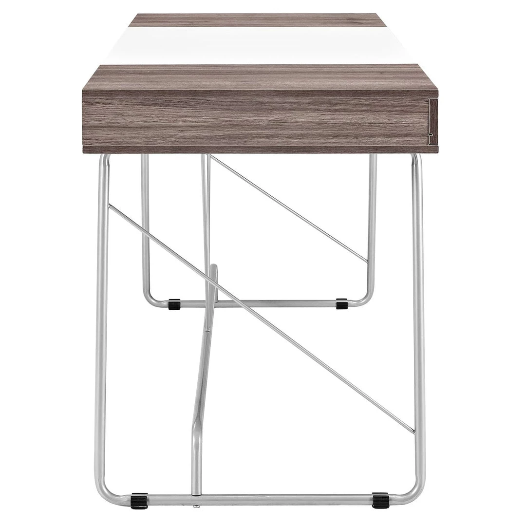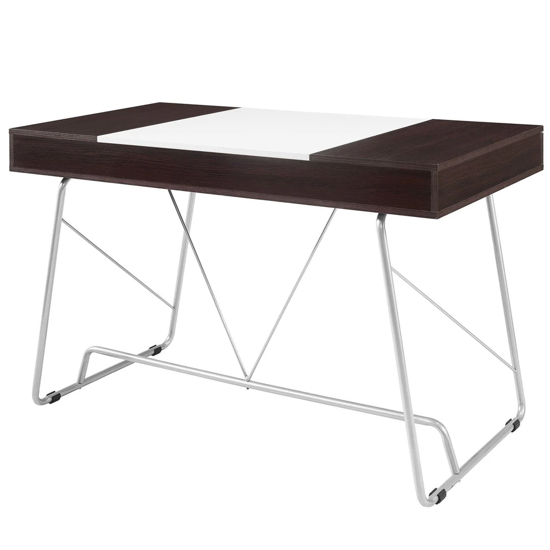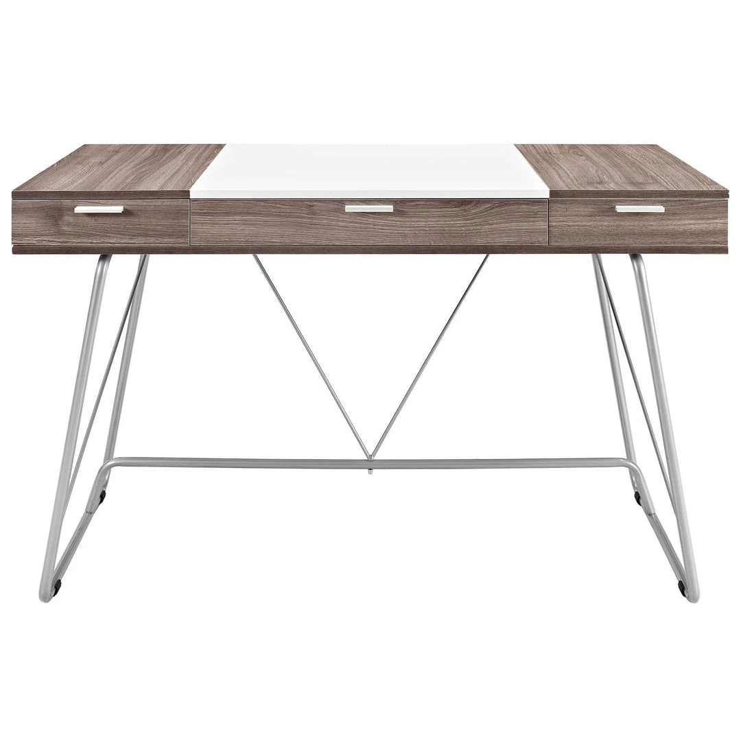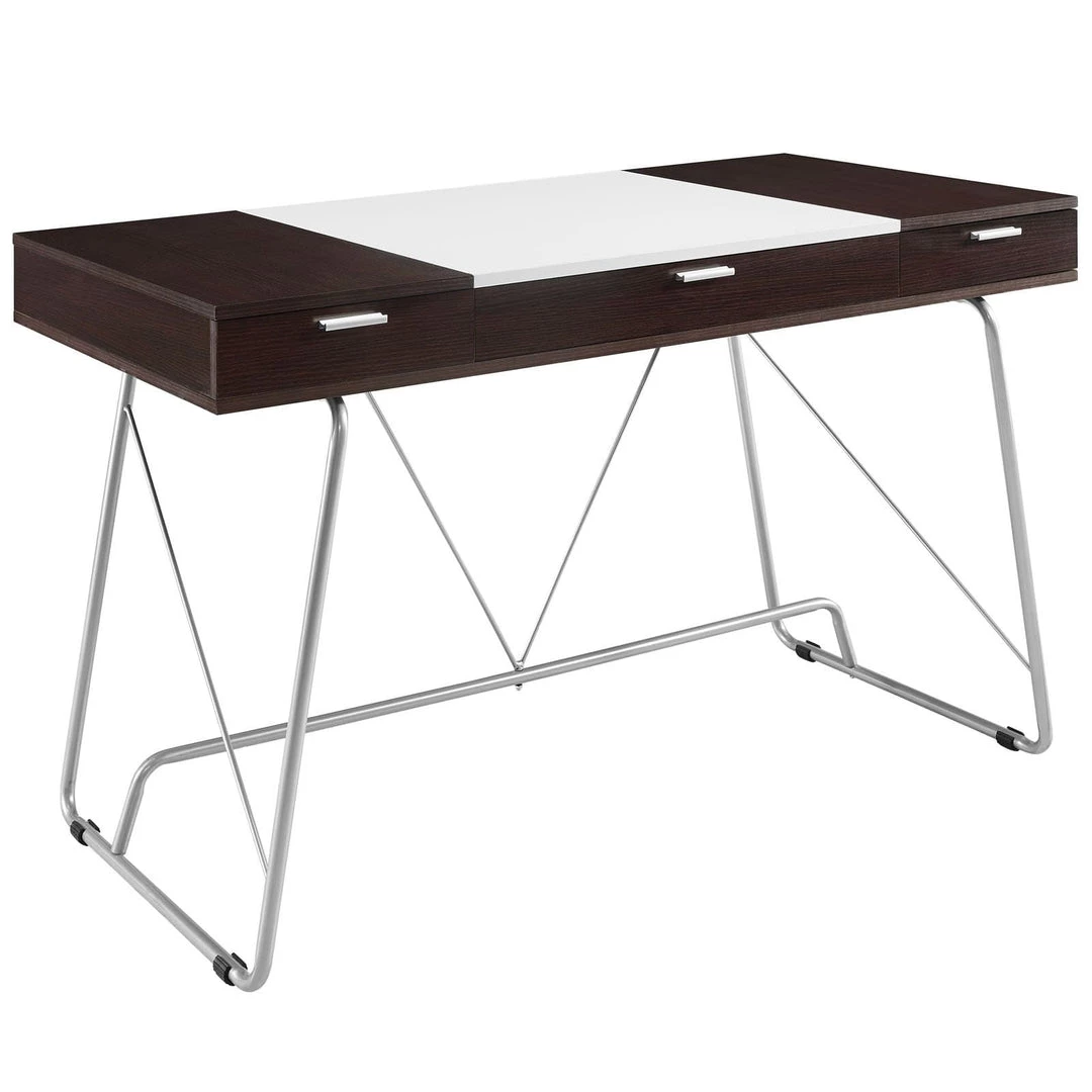 Witness the continual infusion of dual-toned elements with the Panel desk. Made from Melamine covered fiberboard, Panel artfully flanks a solid white center with natural wood-grain toned ends. There are three easy pull-out storage drawers across the length of Panel that make sure all your pads, pens, and other supplies are close at hand. The metal tube base adds a pleasant finish to this contemporary piece perfect for work or home.