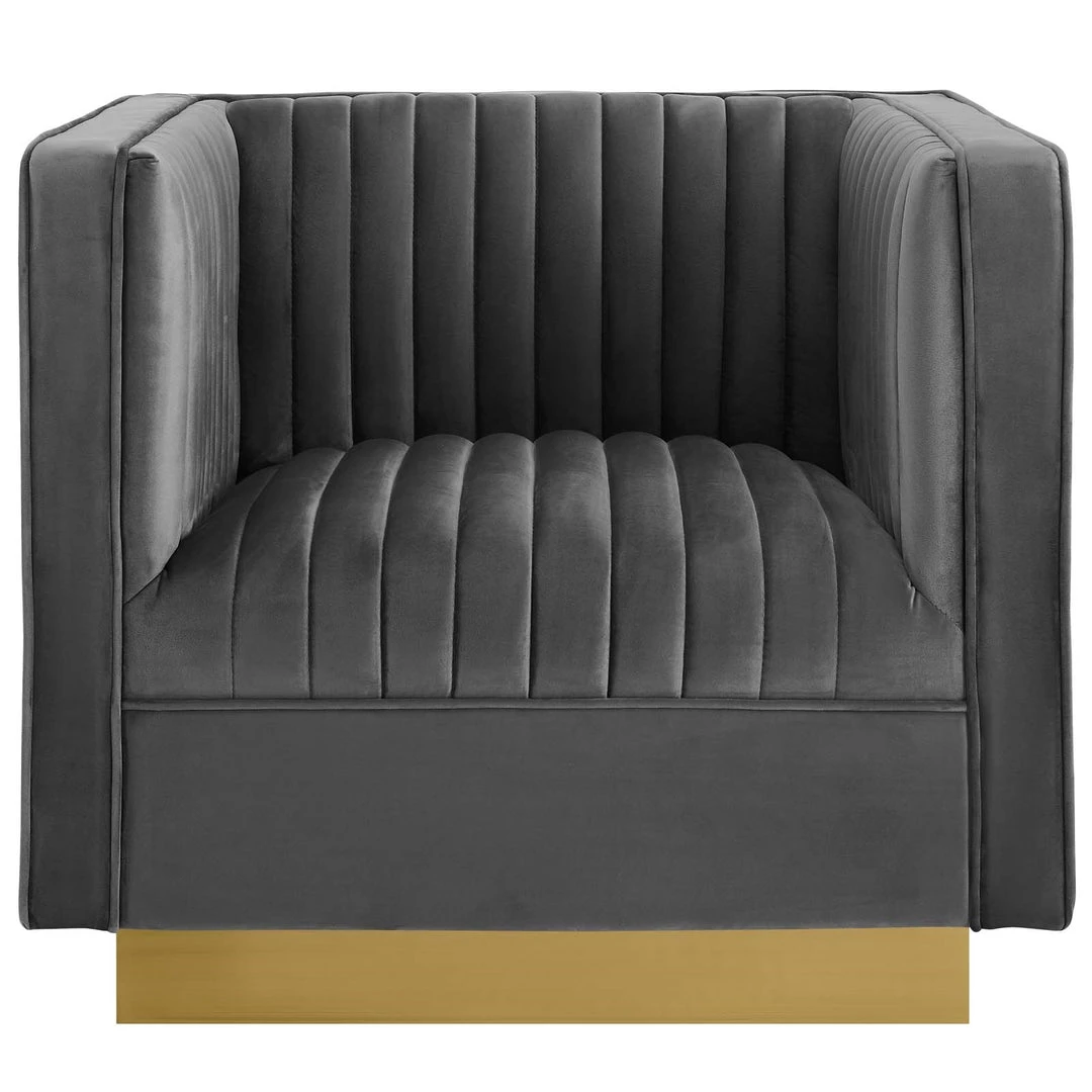 Glamour radiates from the organic linear design of the Sanguine Performance Velvet Armchair. Relax and follow the interior vertical channel tufting for a streamlined effect that adds retro modern glamour to your living room, entryway, lounge room, or home office. Soft, stain-resistant performance velvet upholstery creates a luxurious tactile experience while dense foam padding with individually wrapped spring coil system provides ultimate comfort and support. Sanguine’s palatial accents and premium comfort rest securely on a gold stainless steel base that complements any contemporary modern home or apartment. Maximum weight capacity: 300 lbs.