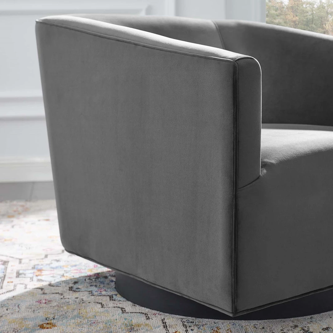 Acquire leisure time with artful ease. Featuring soft, stain-resistant performance velvet upholstery and dense foam padding, the Twist Accent Lounge Swivel Chair comes with an elegant barrel back design perfect for a luxurious seating experience. Resting on a black metal swivel base, this velvet swivel chair makes it easy to maneuver to your position of choice as you relax. Rotate around and enjoy the entirety of your surroundings with this comfortable accent chair perfect for your living room, entryway, bedroom, or lounge area.