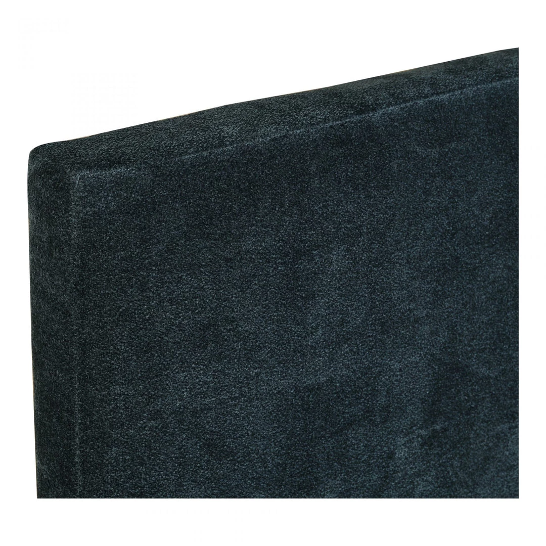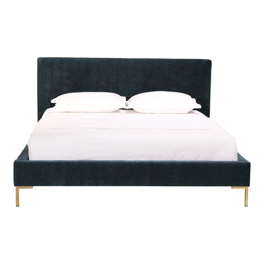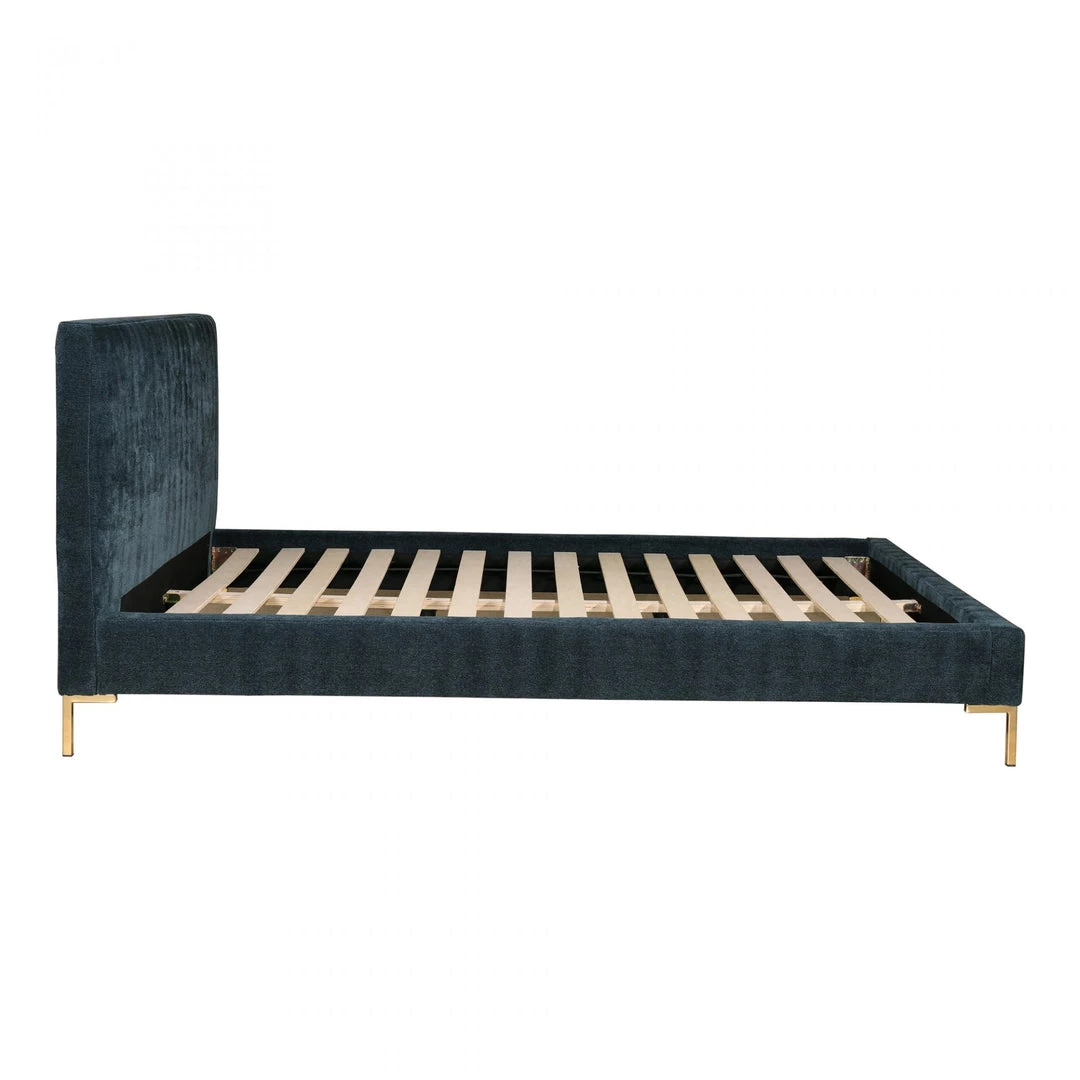 Perfect to breathe new life into your bedroom, Astrid was designed with comfort, luxe, and quality in mind. It is fitted with clean lines and a solid pine frame wrapped in a midnight blue velveteen fabric, complete with a padded and upholstered headboard and golden leg accents. This contemporary modern King size bed is the sort of simple pleasure you need for a seriously stylish sleep.