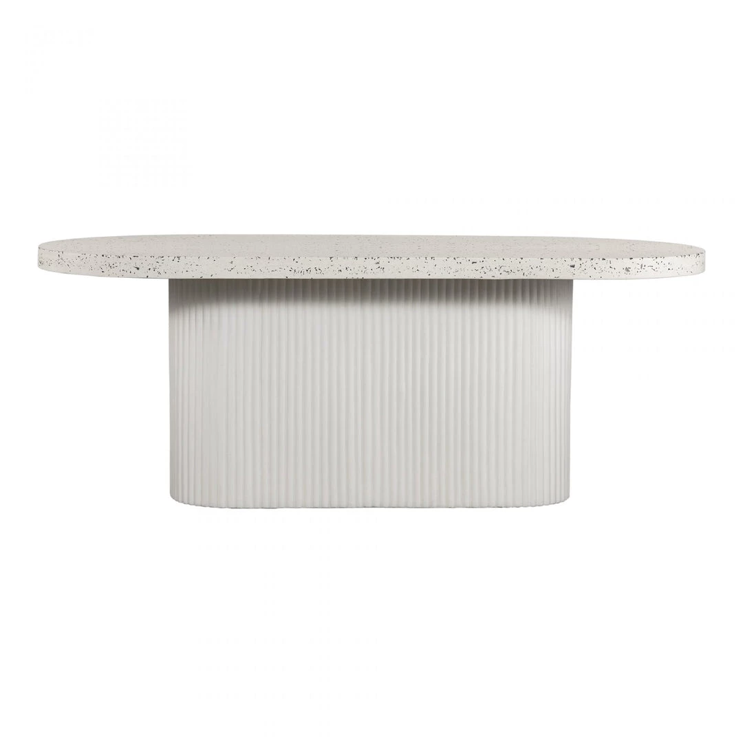 The foundation of beautiful happenings in your backyard, whether youre casually enjoying the late afternoon sun, or dining late into the evenings. Perfect for an open-plan garden or patio setting, with spacious seating for 6, this outdoor dining tables rounded geometric shape contrasts so well within an organic arrangement. Constructed in a unique concrete terrazzo composite, its foam core tabletop focuses on the natural beauty of minerals and adds visual texture with its ribbed, hollow base. A contemporary, ergonomic shape that will fit invitingly into any outdoor scene.