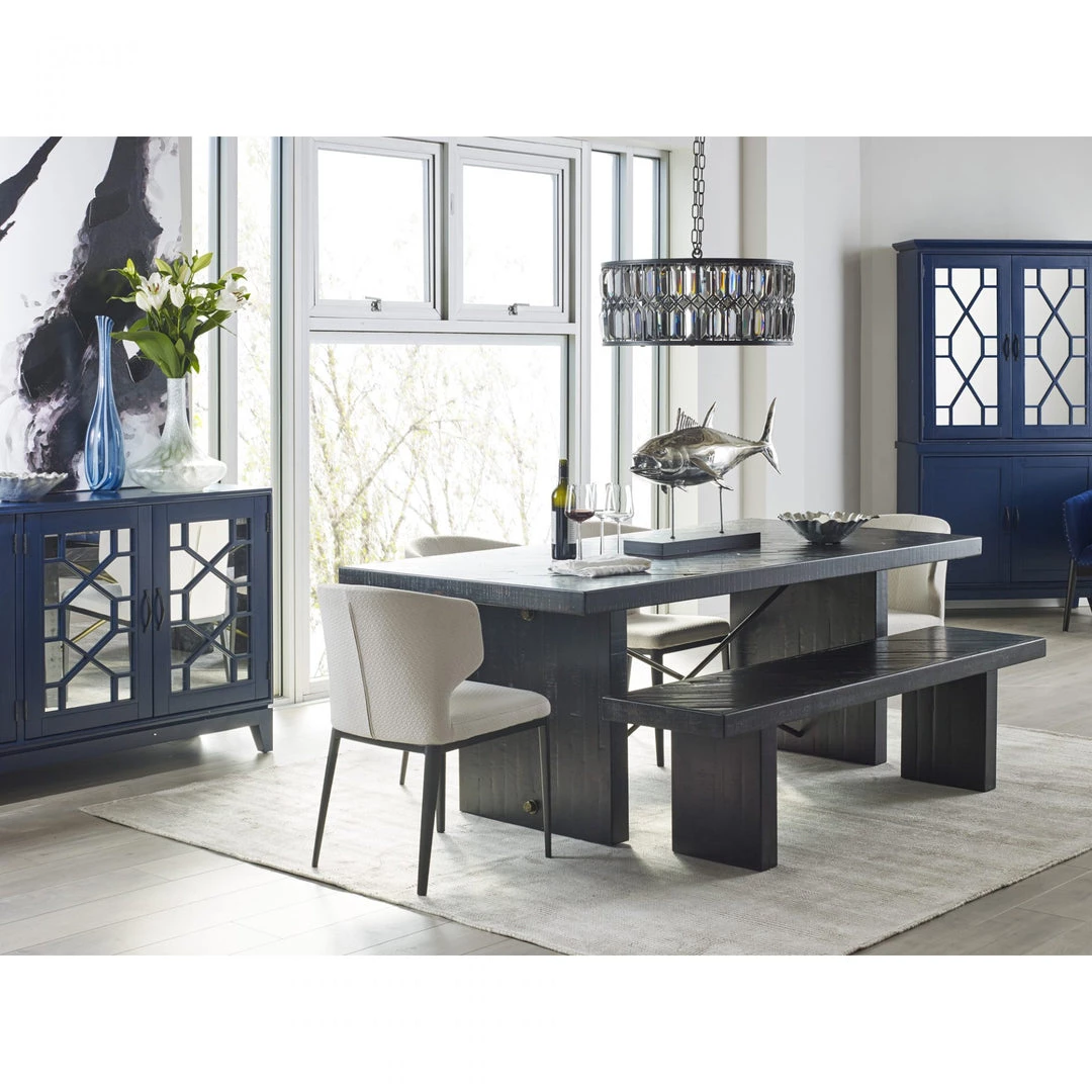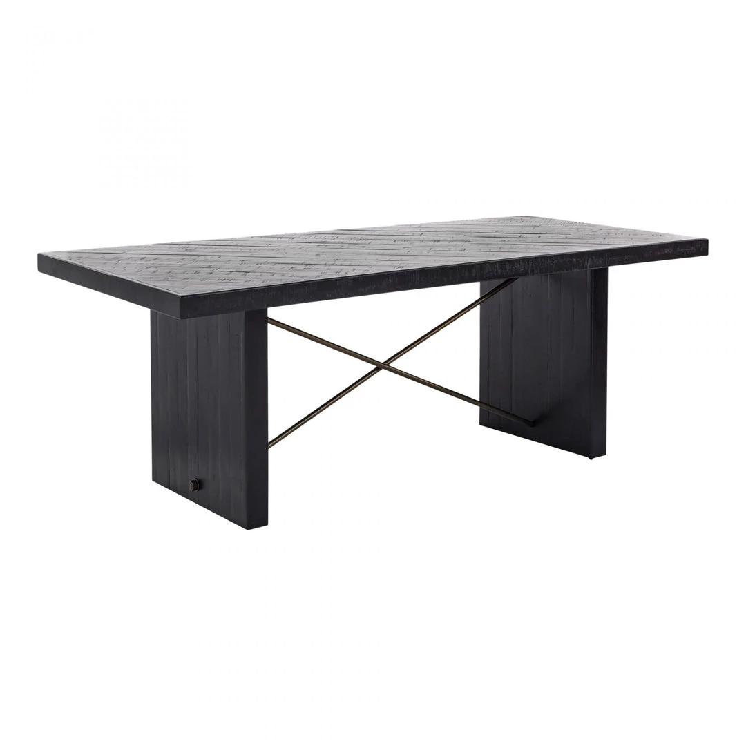 The Sicily collection has a rustic wood top, with a glossy ebony stain and a contemporary parquet patterned top. Steel supports and bolts give the piece a slight industrial edge. The overhang allows for additional seating on the ends, allowing room for up to 8.