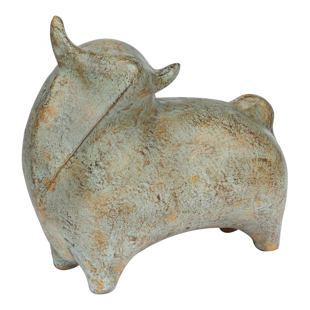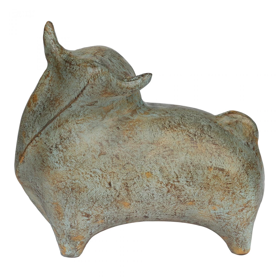 An abstract-style bull sculpture with a nice, patina finish. Made with ecomix, a mix of natural and reclaimed materials such as paper and chalk, for an eco-friendly product.