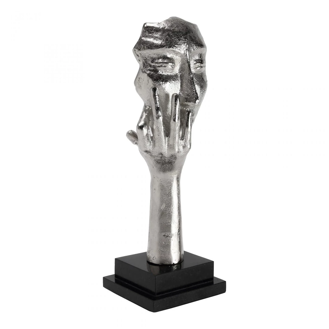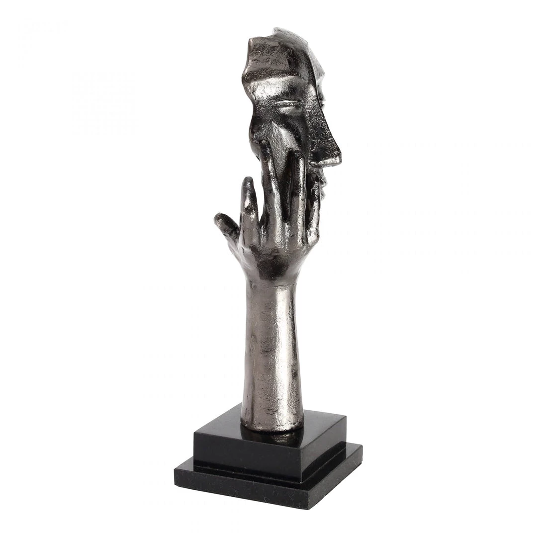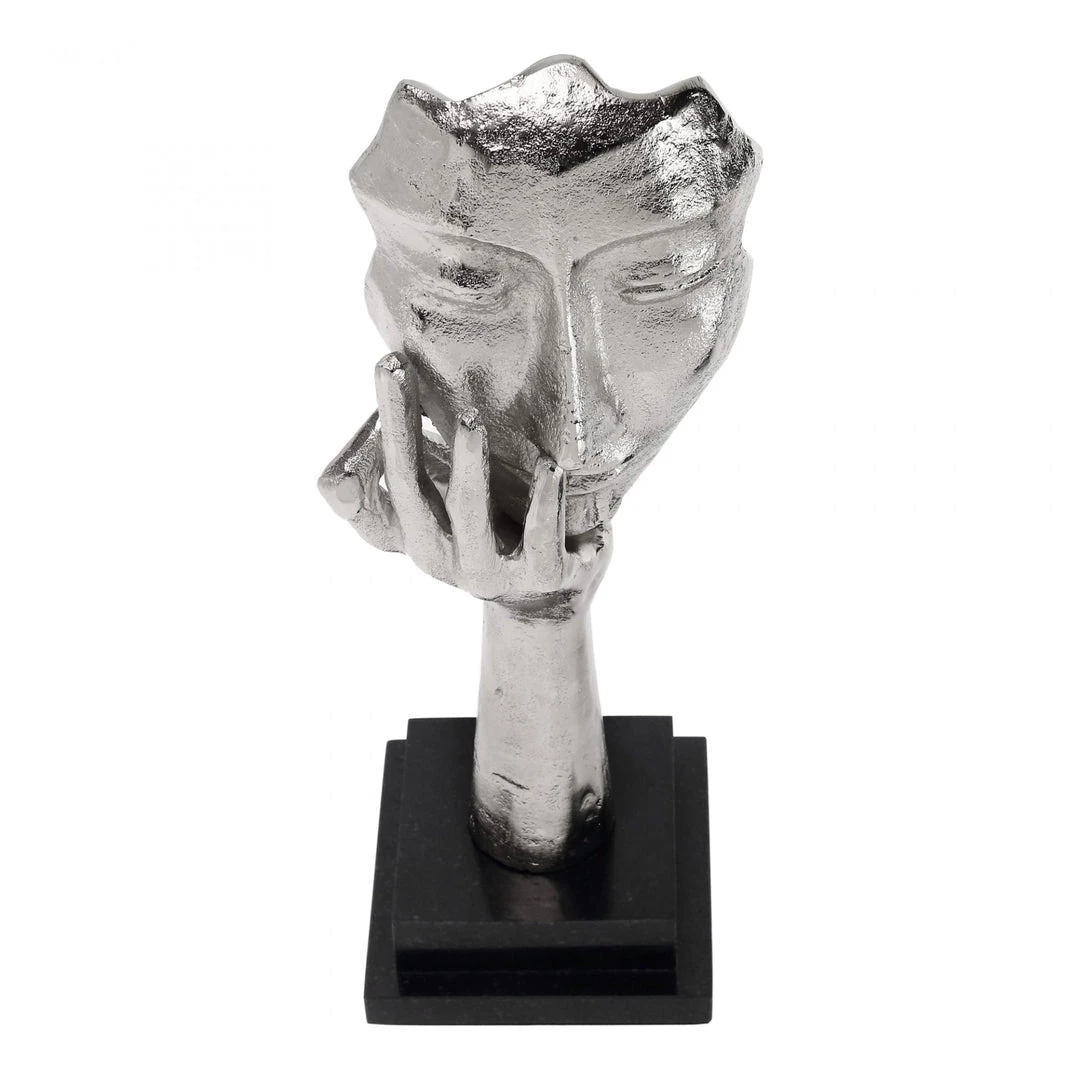 A single hand holds a perched face with eyes closed, showcasing intense contemplation through unique presentation. This accent features a detailed aluminum construction and sits on a black marble base for a chic display. Elevate your living space with the contemporary art of the Ponder sculpture.