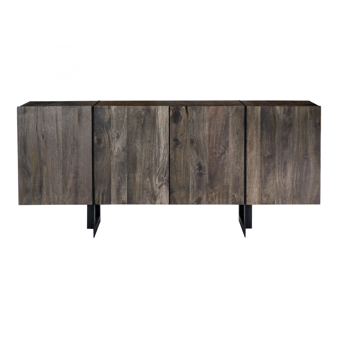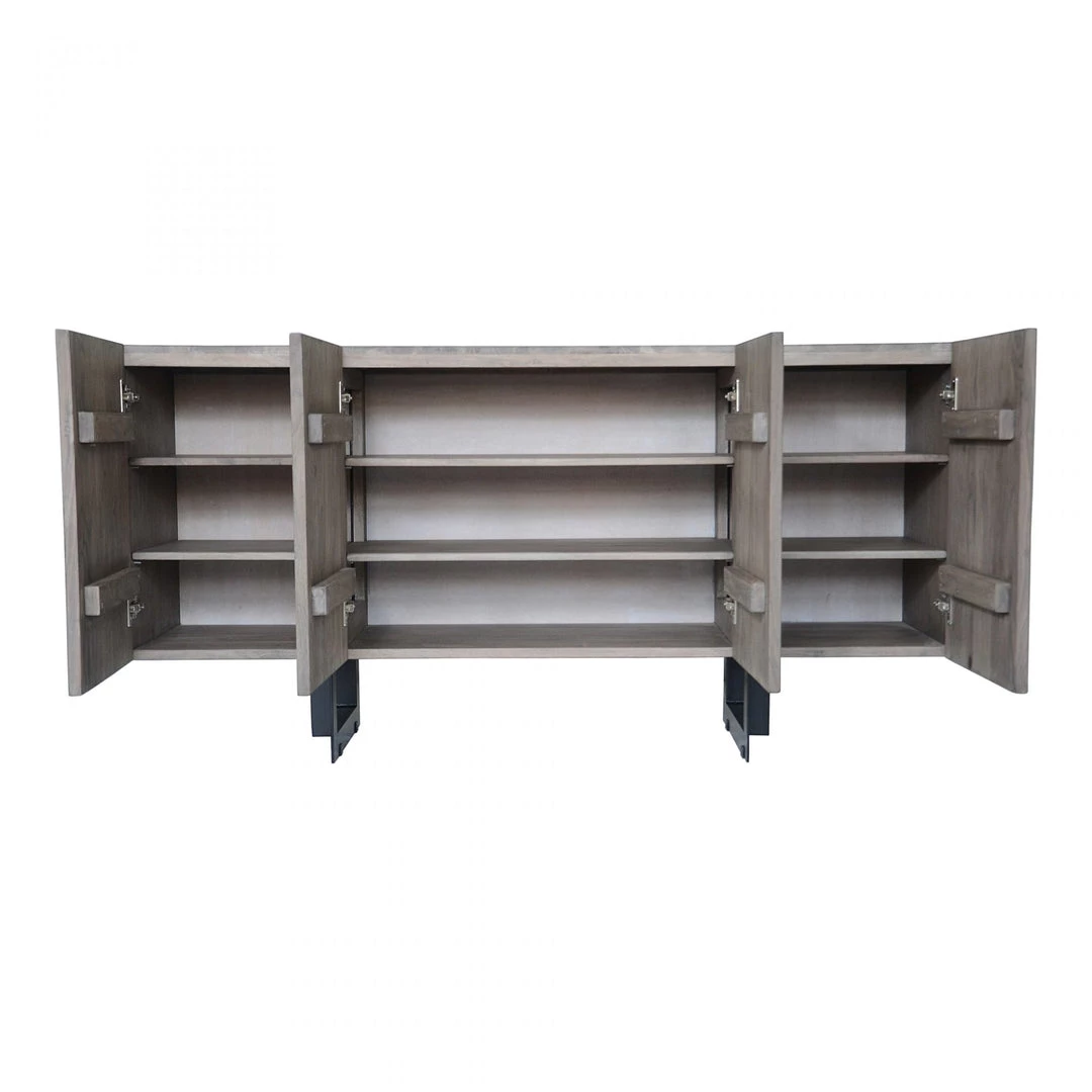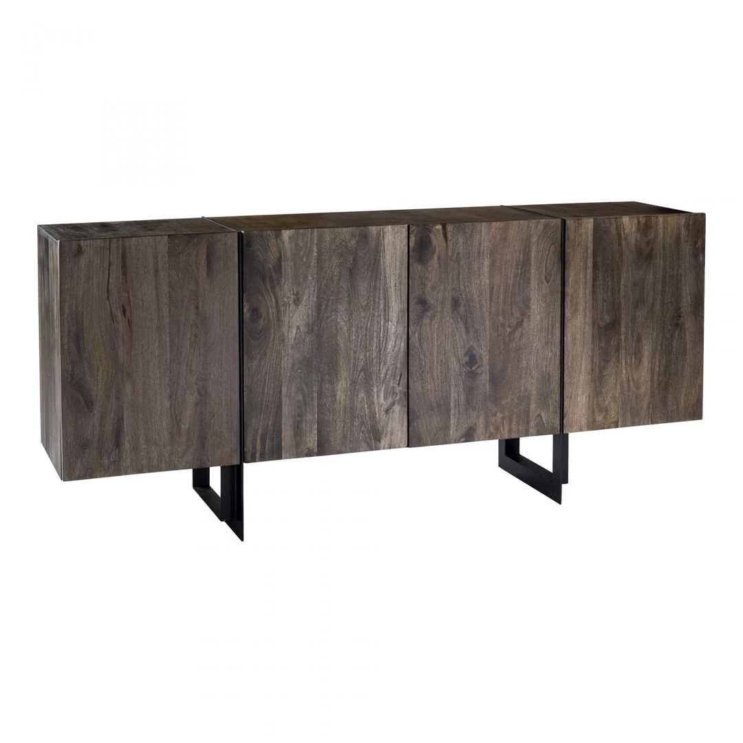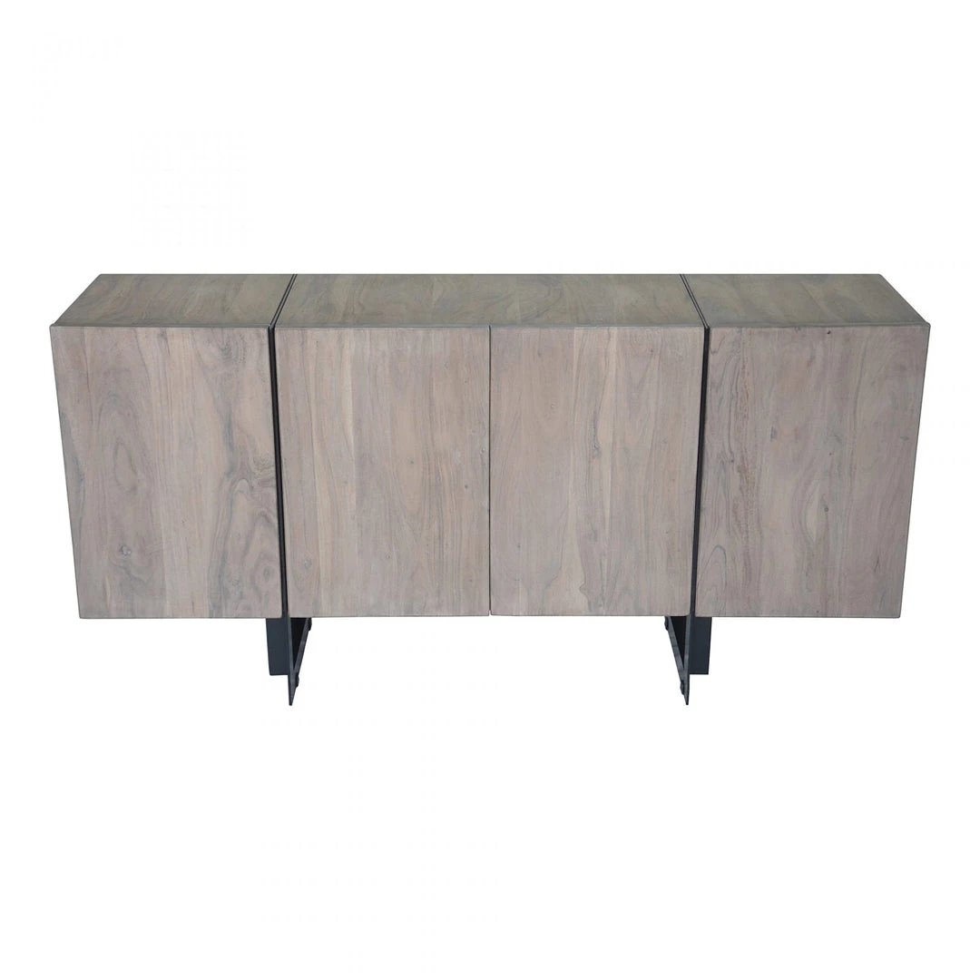 A contemporary, industrial sideboard with a pale-grey finish. Tons of storage to help keep your dining or living room neat and tidy. Crafted from solid wood and black, powder-coated iron for top-notch quality.