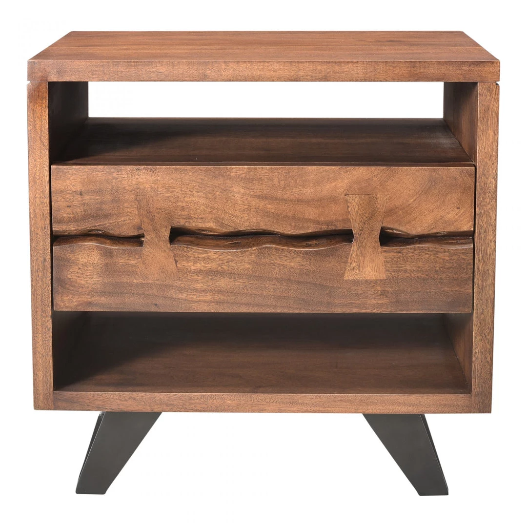 The Madagascar Nightstand is constructed with solid acacia wood on an angular, steel legs to achieve that rustic, industrial look. It features a single drawer with two open spaces for your bedside needs.