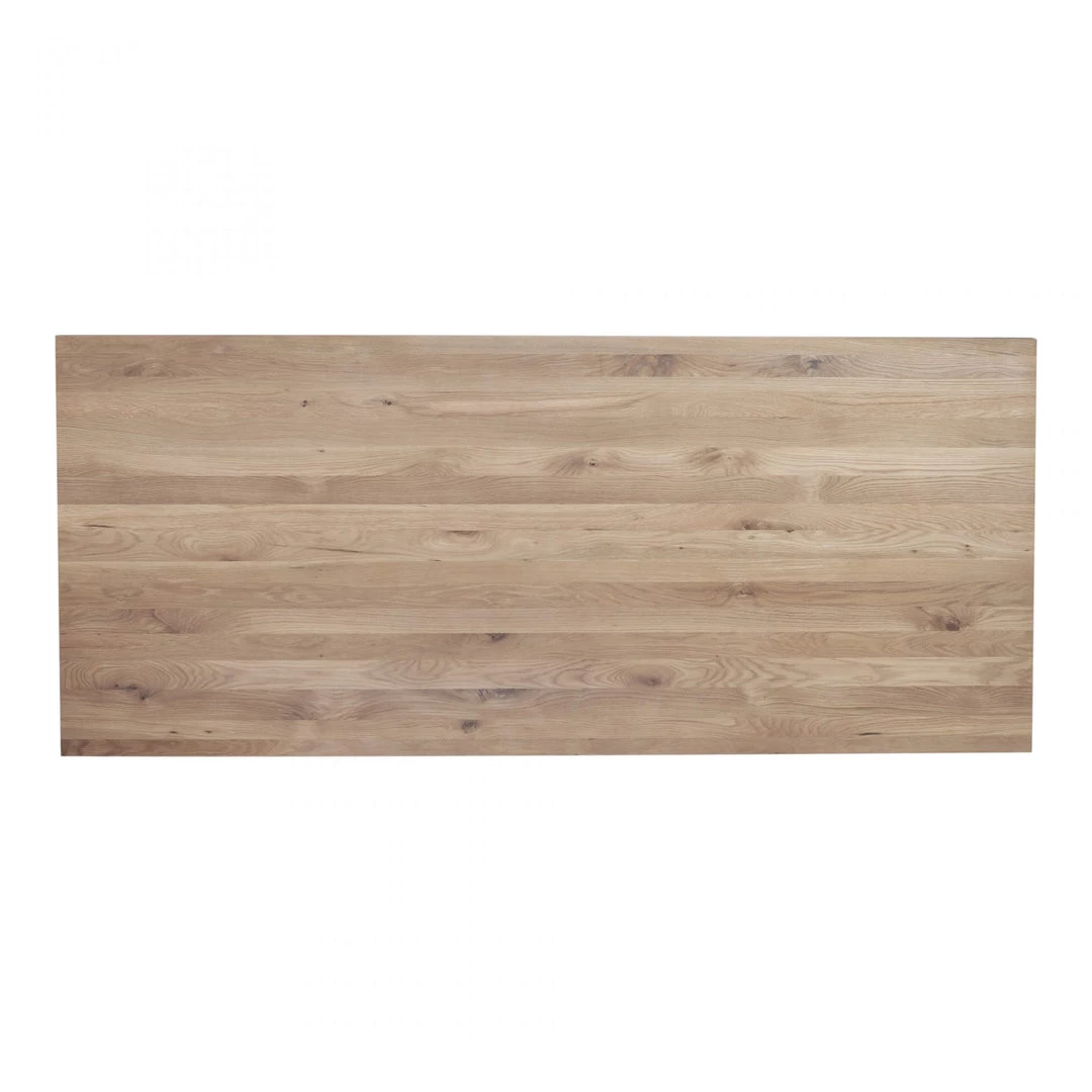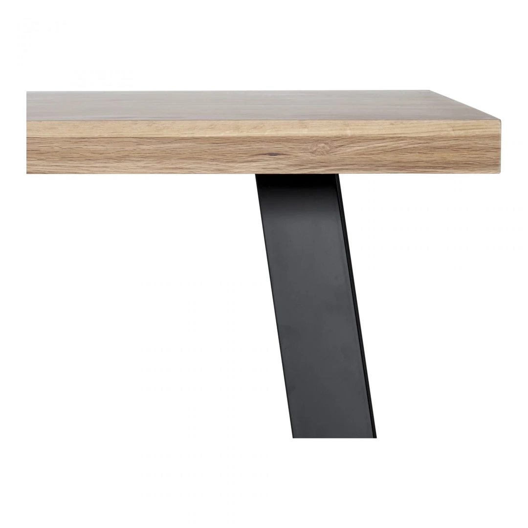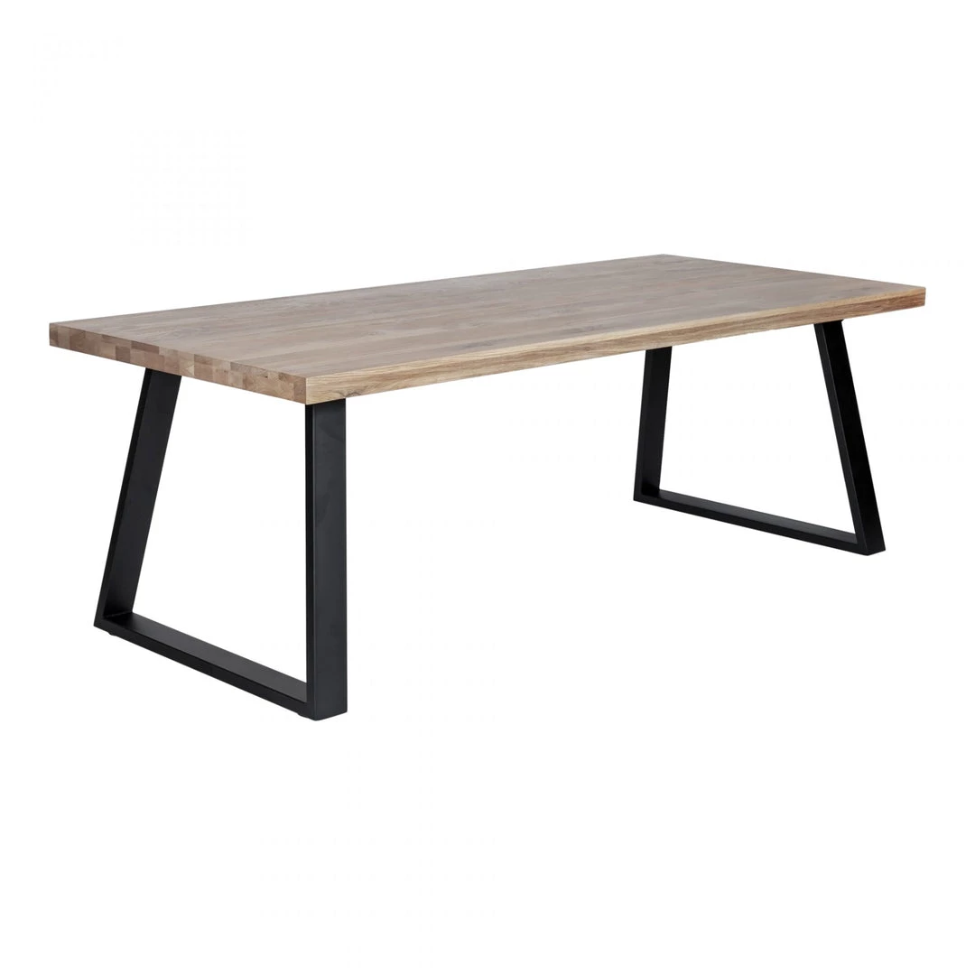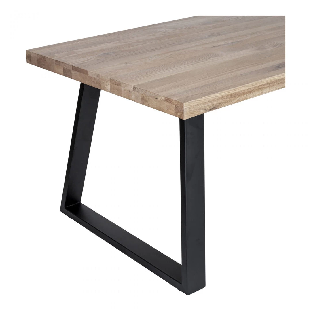 Rugged chic. This richly textured solid oak table top features its own unique knots, whorls, and woodgrain. Strong metal legs give it a stylish industrial finish. Comfortably seats up to six people and offers plenty of table space whether you’re reading the paper over breakfast or having family dinner.