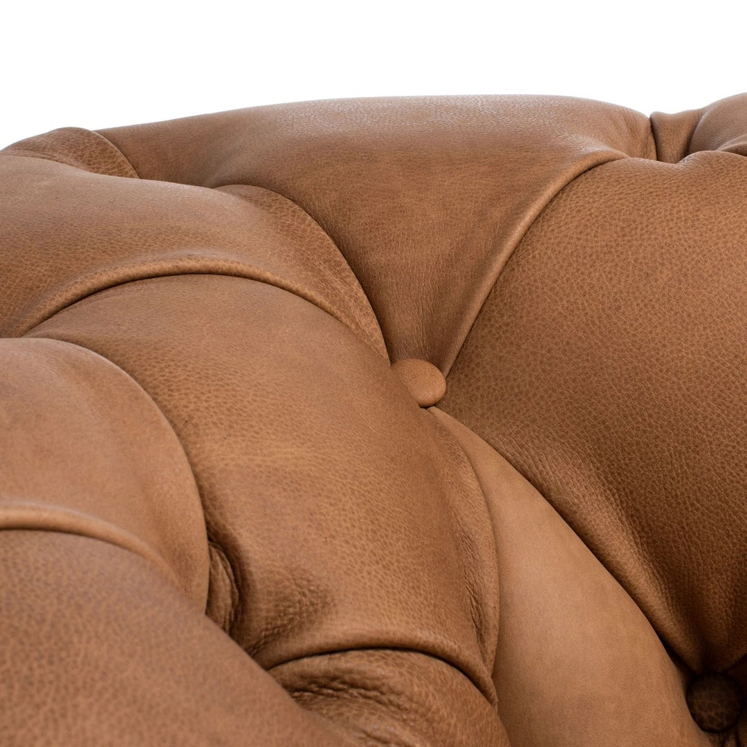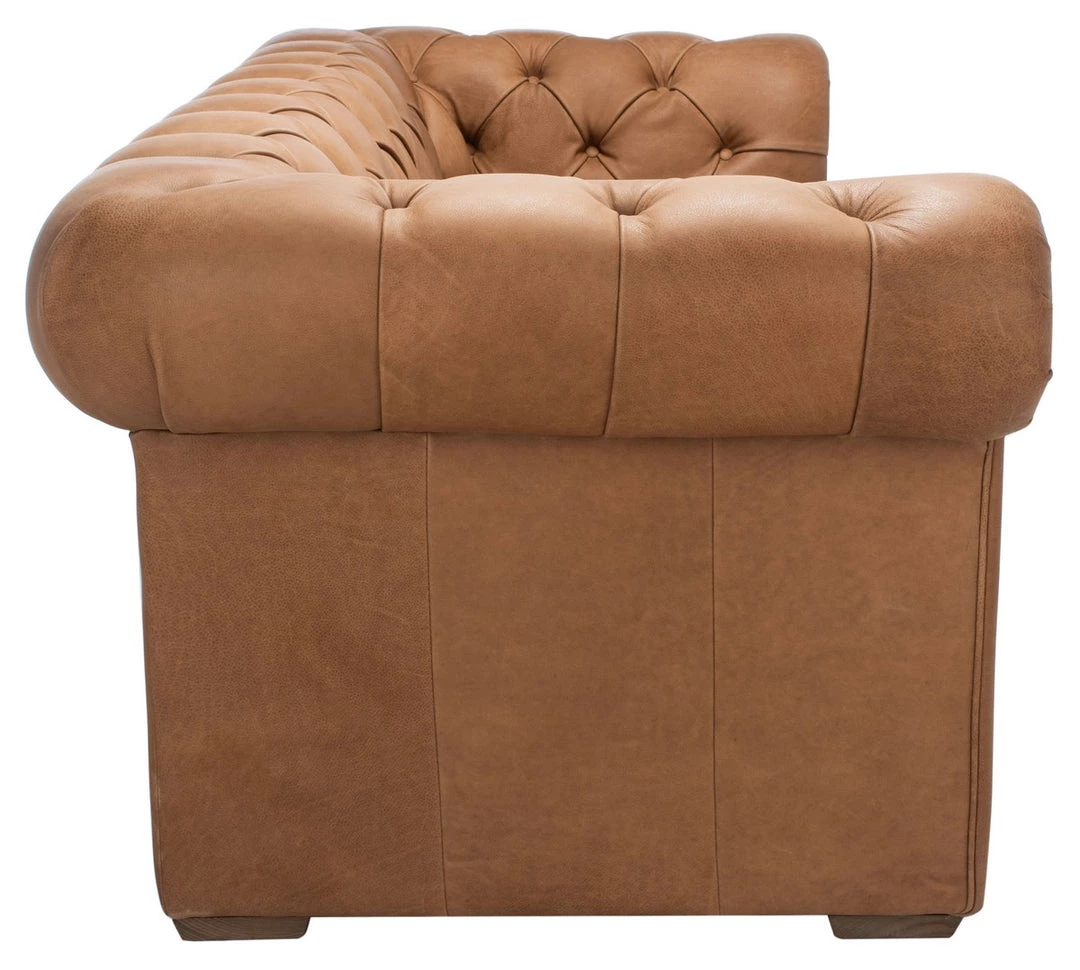 The dignified air of the classic Chesterfield couch is brilliantly recreated in this Andres Sofa. Flaunting richly button-tufted top grain Brazilian leather upholstery in a warm camel tone, Andres is a must-have for living rooms that crave a touch of traditional grandeur.
