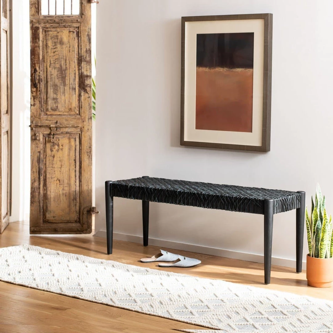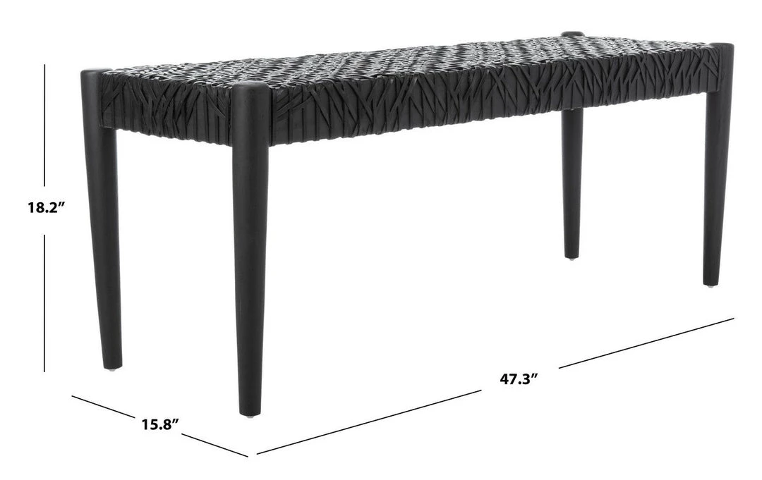 Highlighting the best of contemporary design, the clean lines of this Bandelier Bench are given a couture upgrade with chic designer details. Bandelier’s interlaced brown cowhide leather seat pairs beautifully with its deep brown teak, giving any interior enticing visual intrigue.