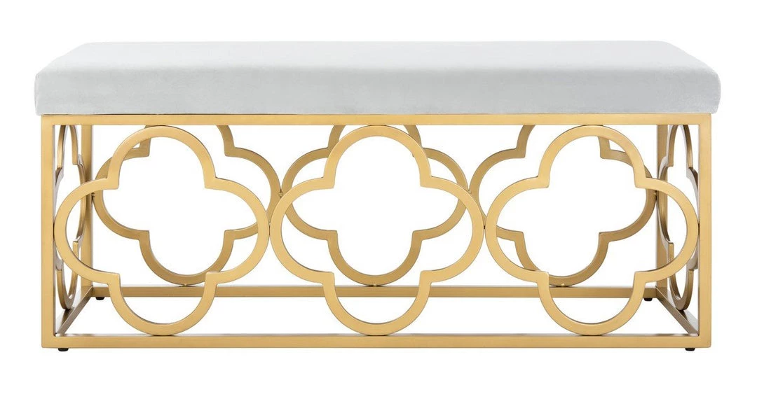 Traditional class meets modern glamour in this fabulous Fleur Bench. Fleur’s open quatrefoil design brings airy elegance the entryway, living room, or master suite. Shimmering in a gold liquid finish and cream velvet seat, Fleur seamlessly enriches the color scheme of any decor.