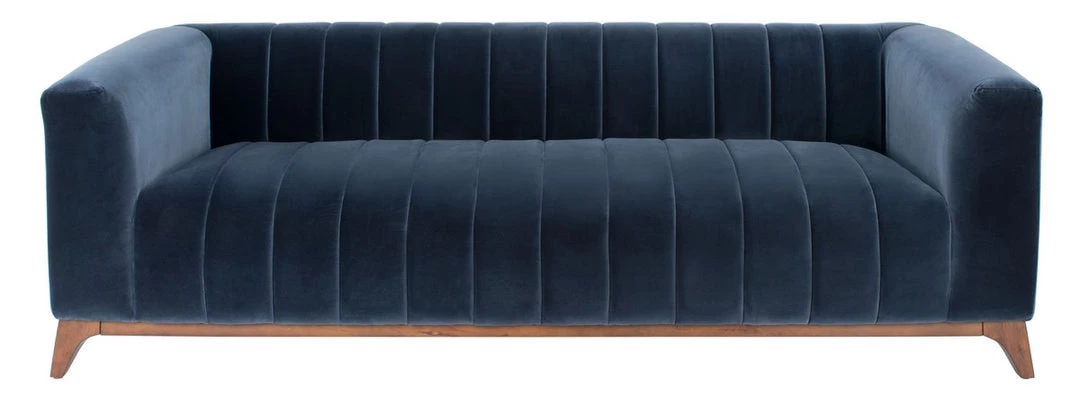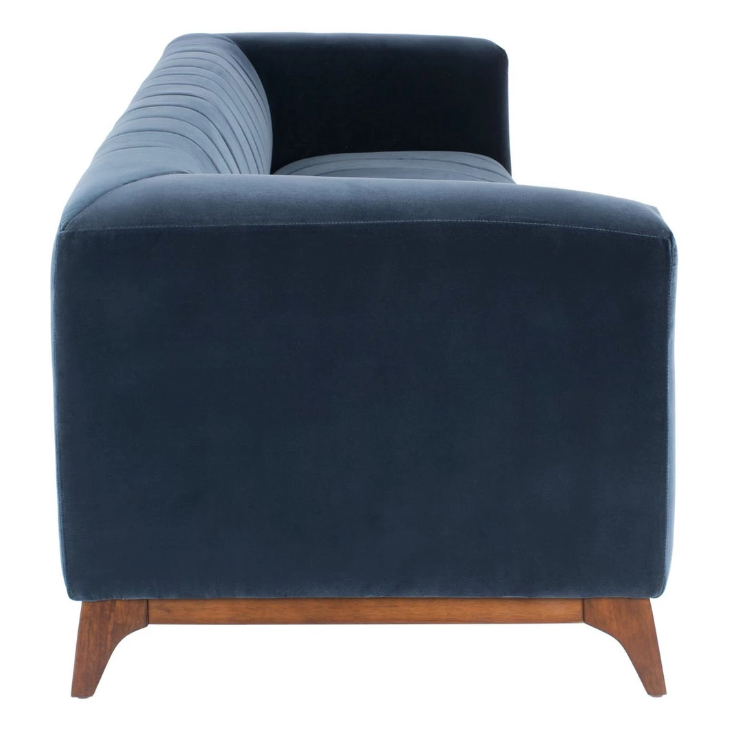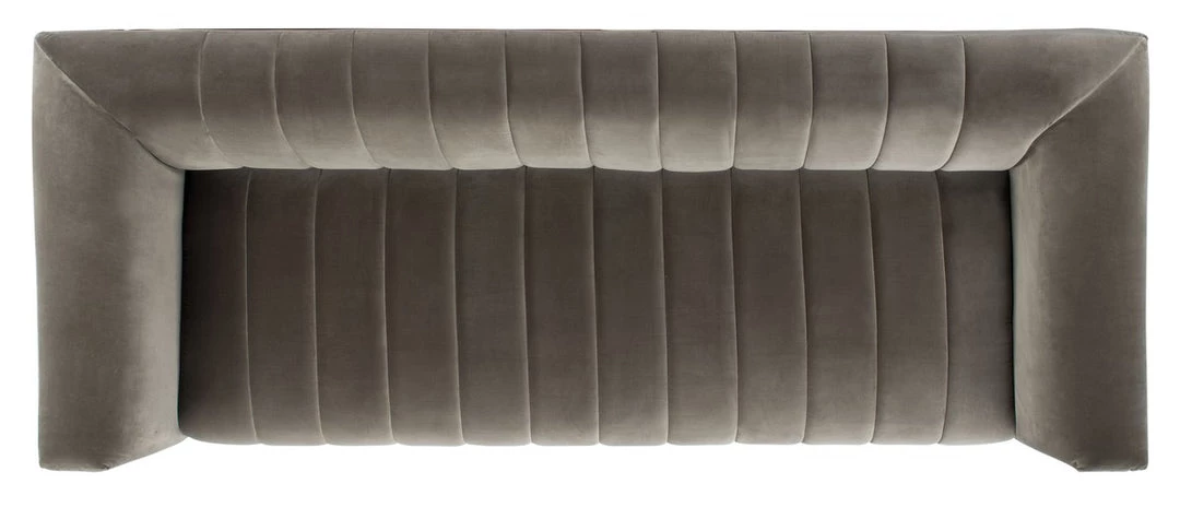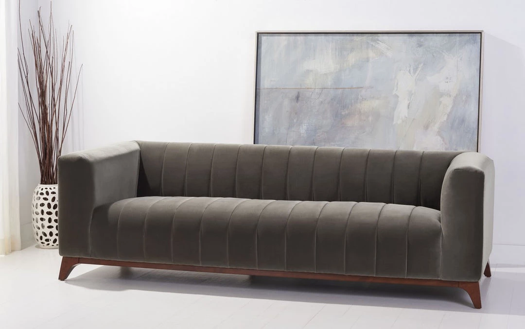 This Dixie Sofa luxuriously refreshes the classic tuxedo silhouette for today’s contemporary-chic living rooms. Channel-tufted details give Dixie’s dark grey cotton velvet a dynamic sense of motion, while its splayed walnut-finished base provides a touch of airy, Mid-Century appeal.