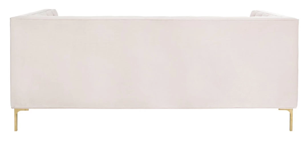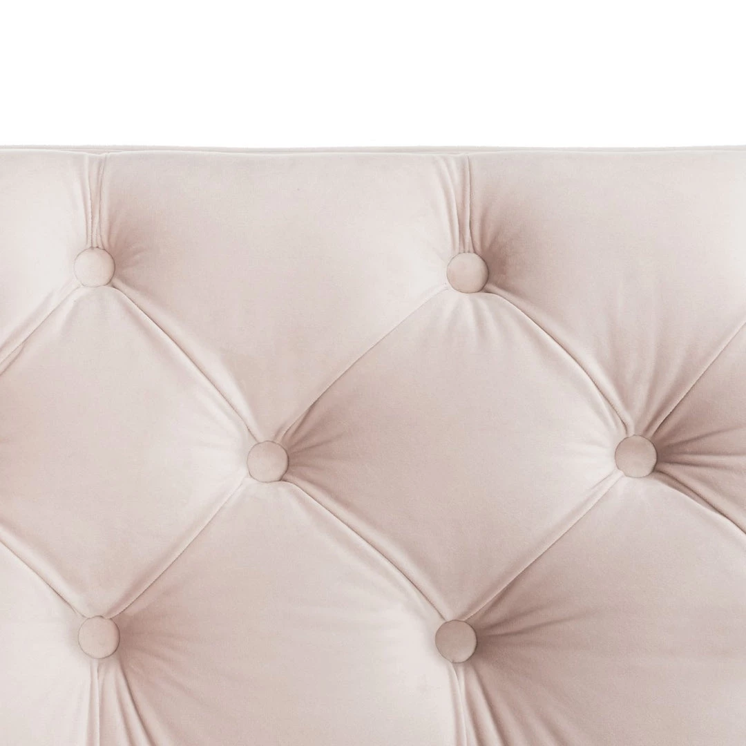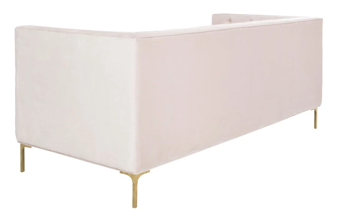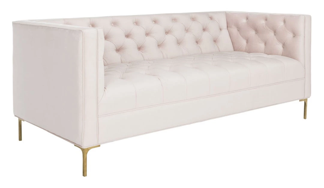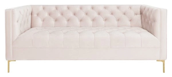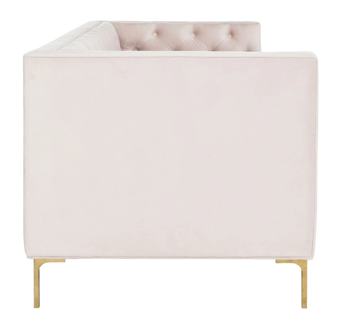 This deluxe velvet tufted sofa was inspired by bold, contemporary Italian style. An instant focal point in any living room, its sophisticated tufting highlights its plush blush pink velvet upholstery. Its gold metal finish illuminates its modern legs.