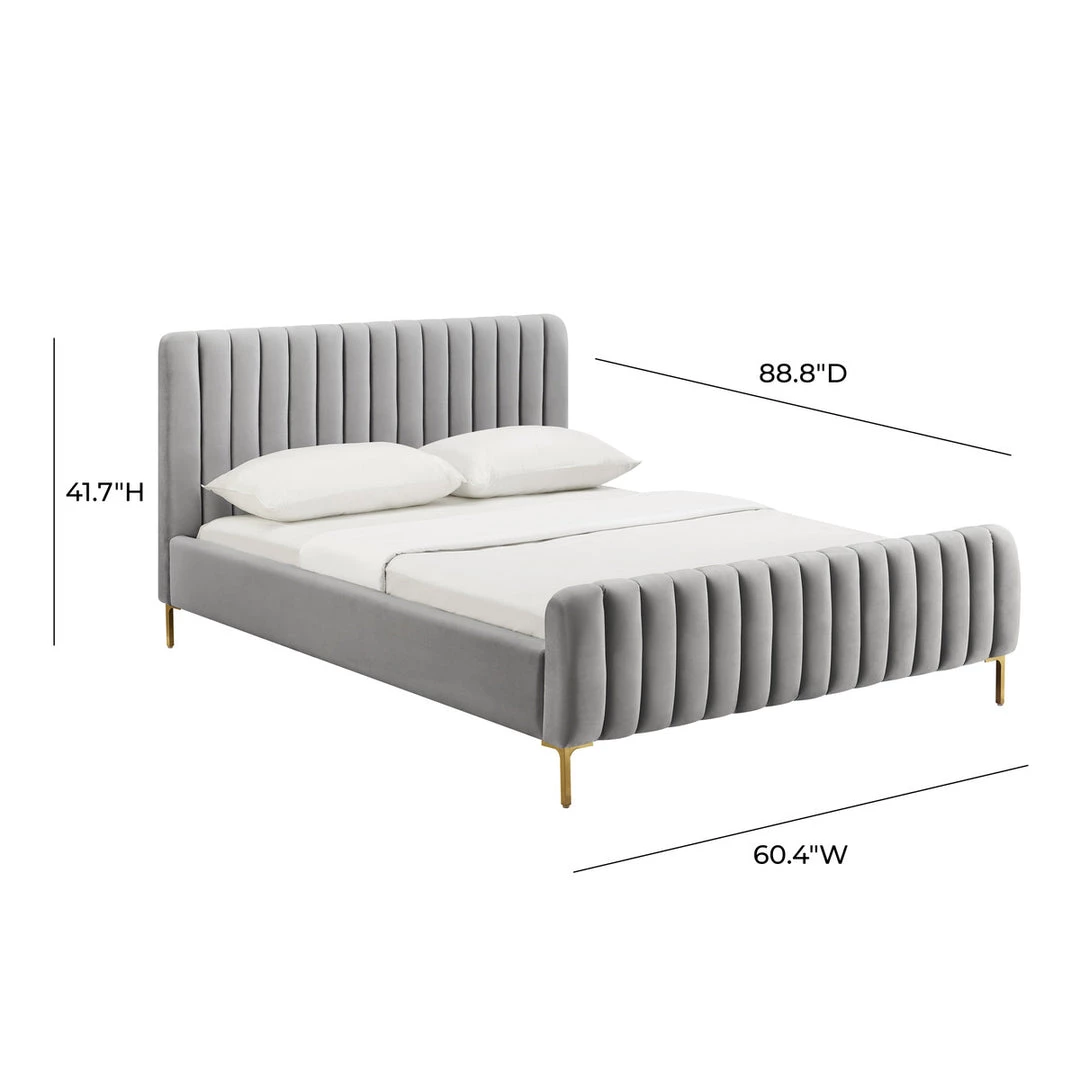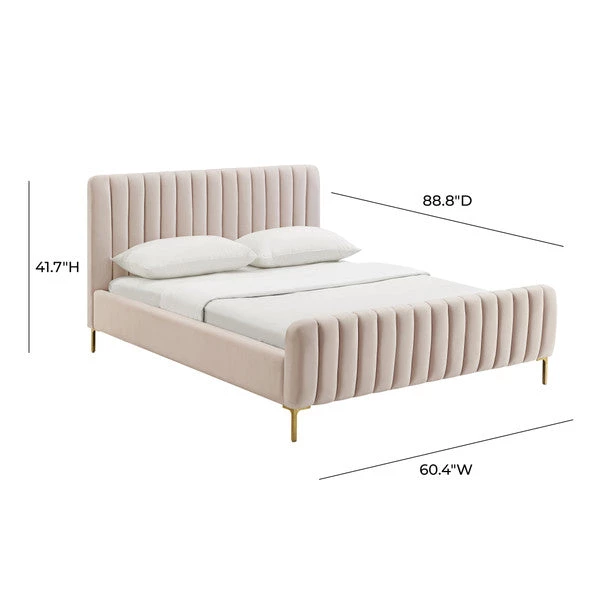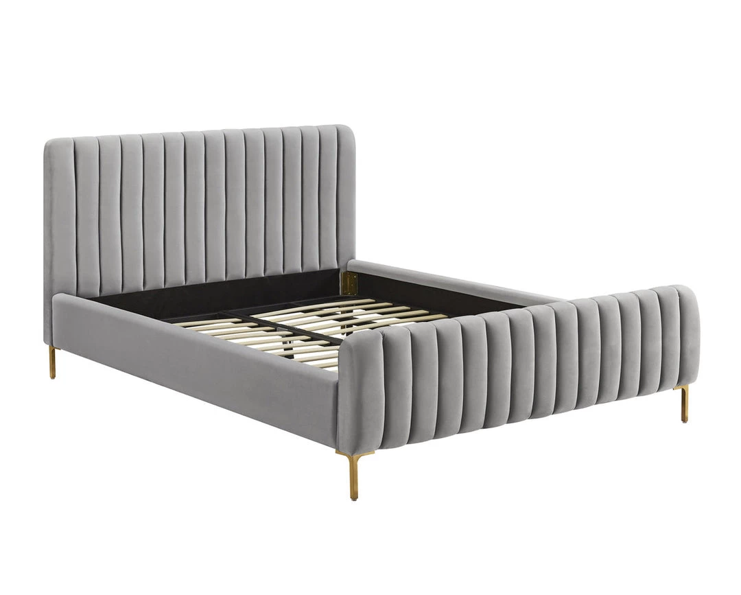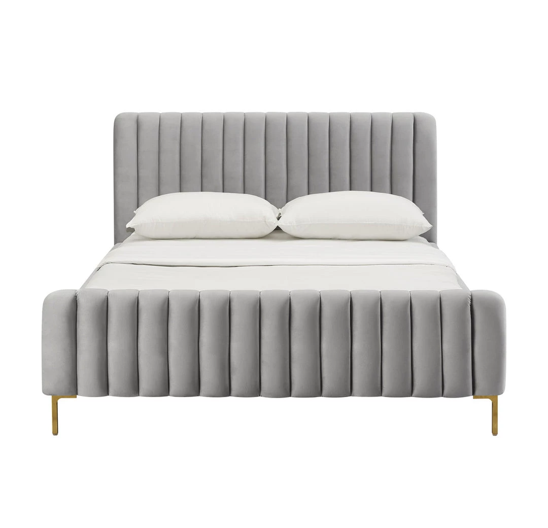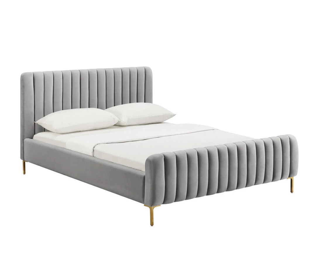 We can’t guarantee your dreams will come true, but at least we can help you dream in style. The Angela bed features glam design, channel tufting and gold legs that pop against the sumptuous velvet upholstery. Available in full, Queen and King, in multiple color options.