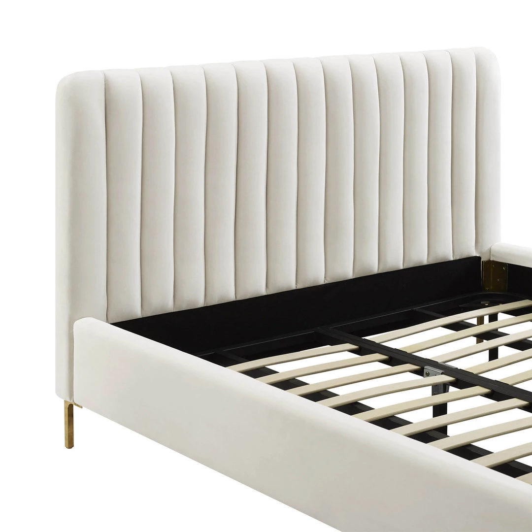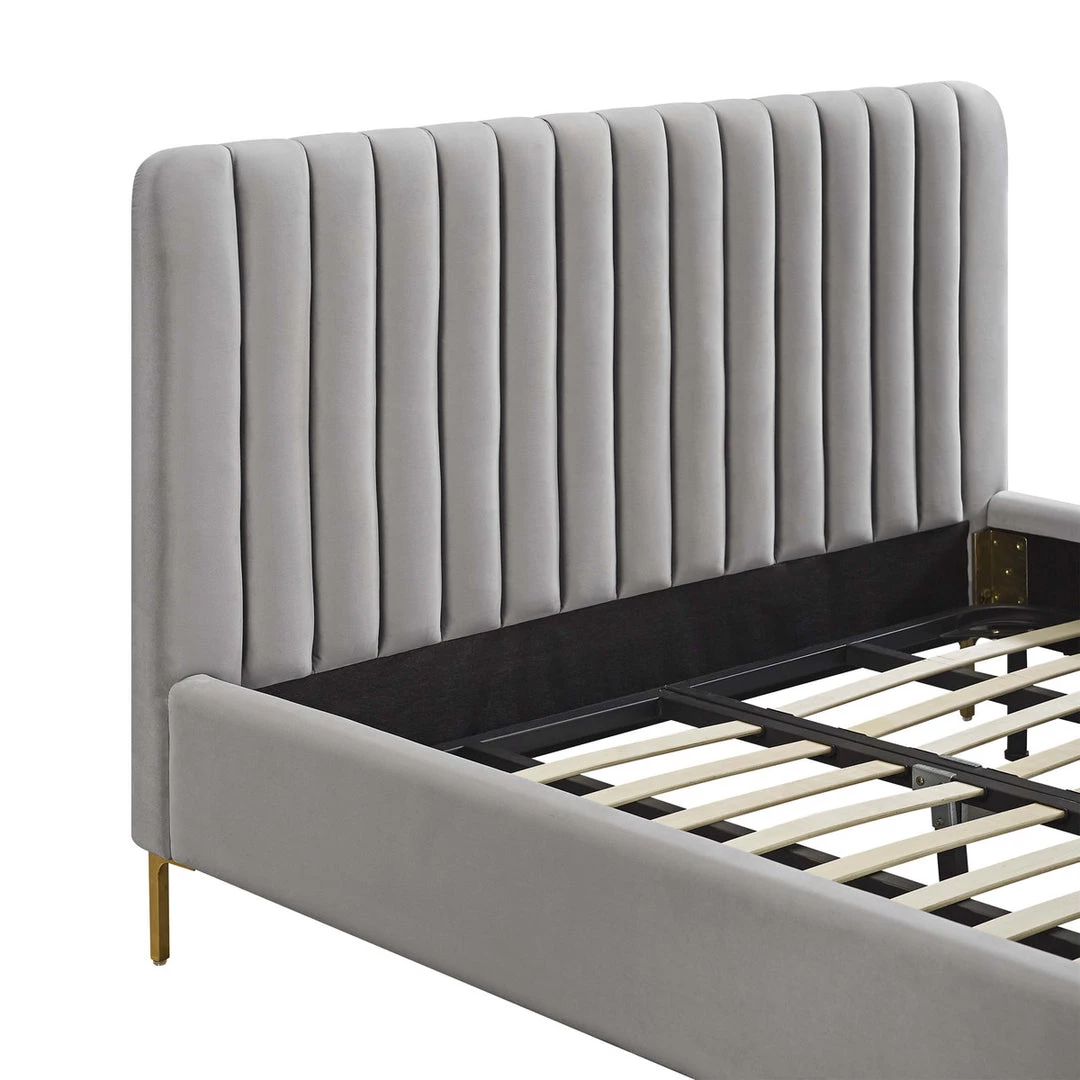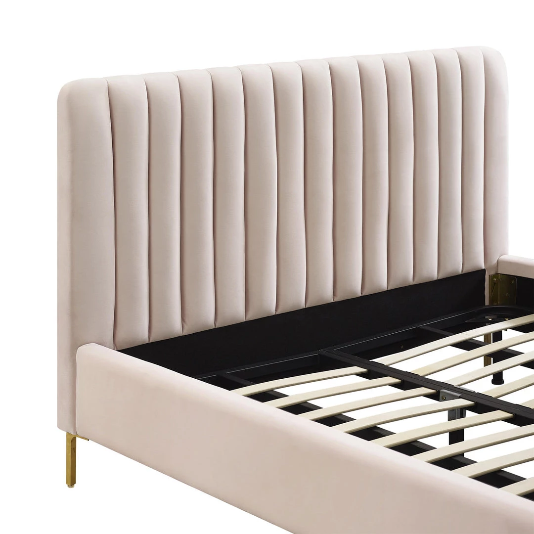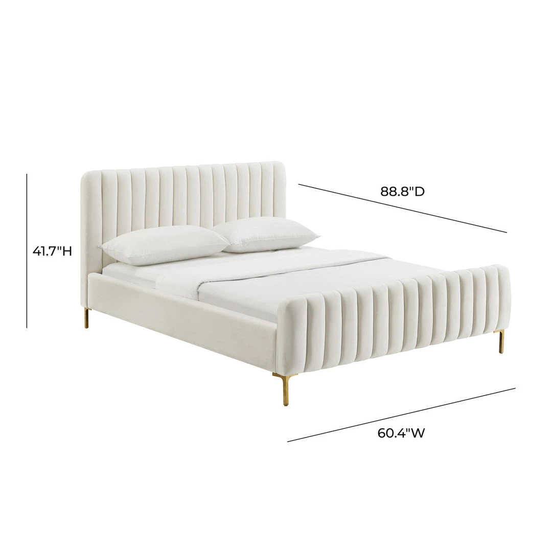 We can’t guarantee your dreams will come true, but at least we can help you dream in style. The Angela bed features glam design, channel tufting and gold legs that pop against the sumptuous velvet upholstery. Available in full, Queen and King, in multiple color options.