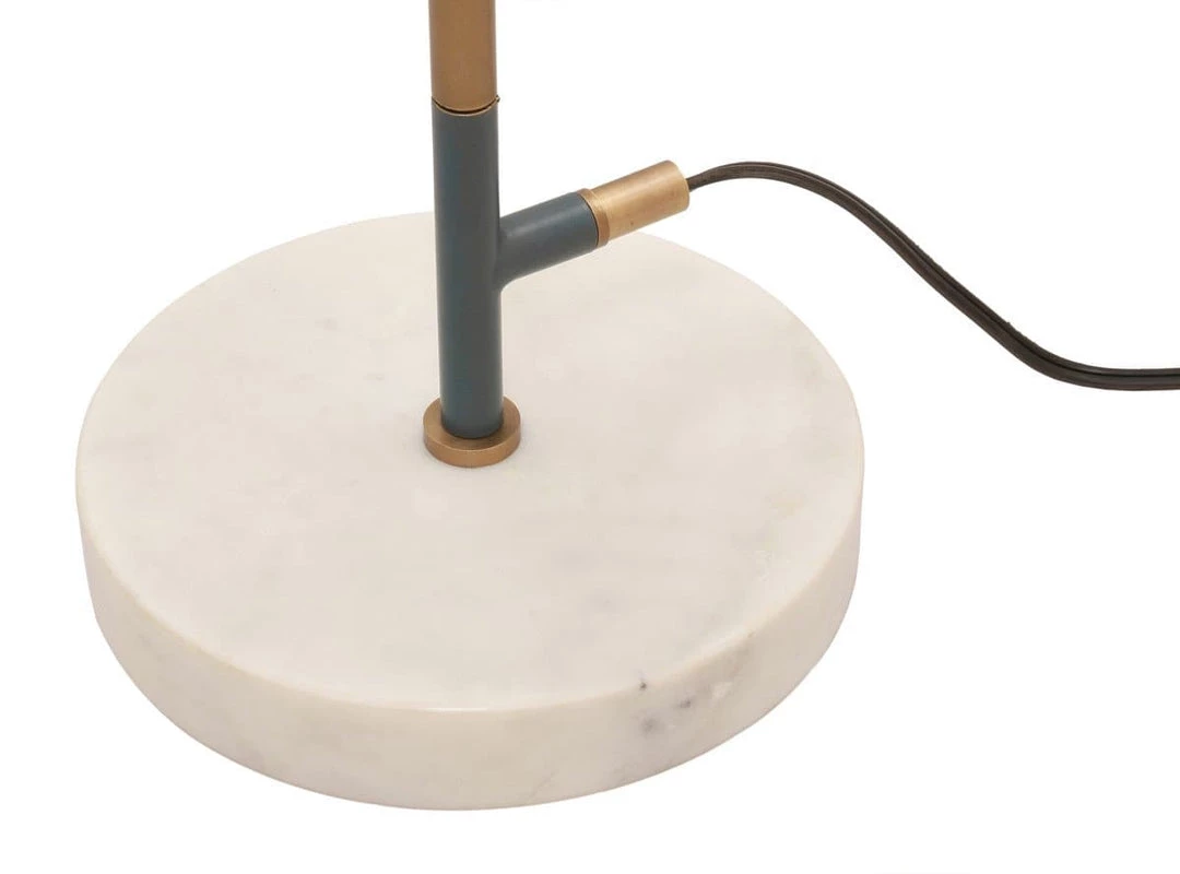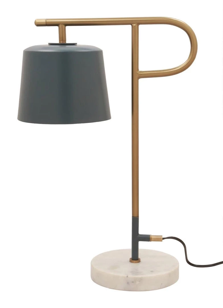 Full of modern appeal, this table lamp flaunts a grey conical shade beautifully offset by its curved brass neck and white marble base.
