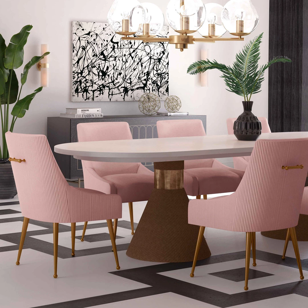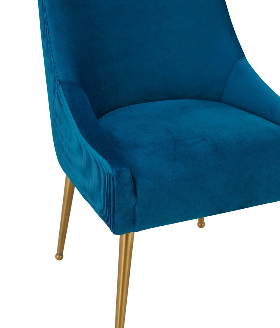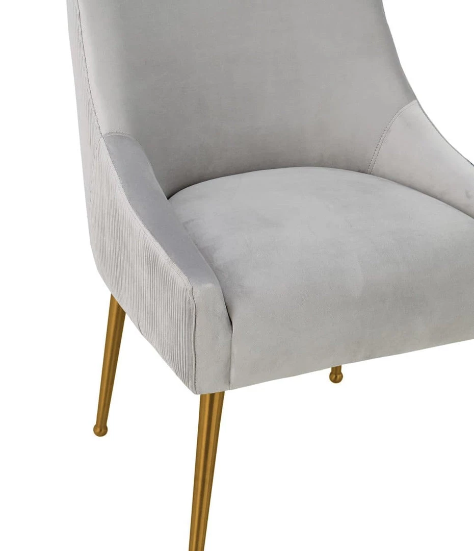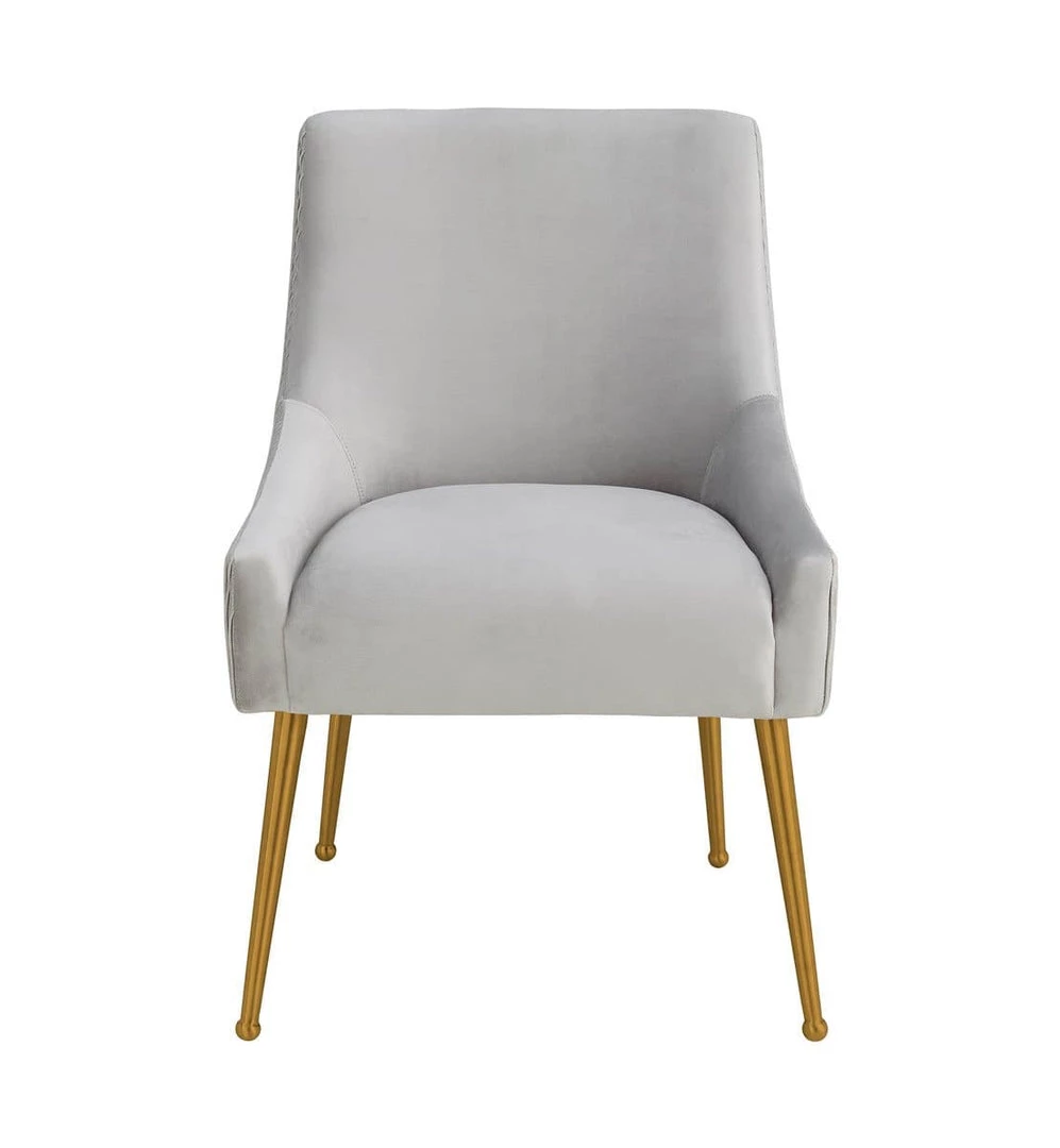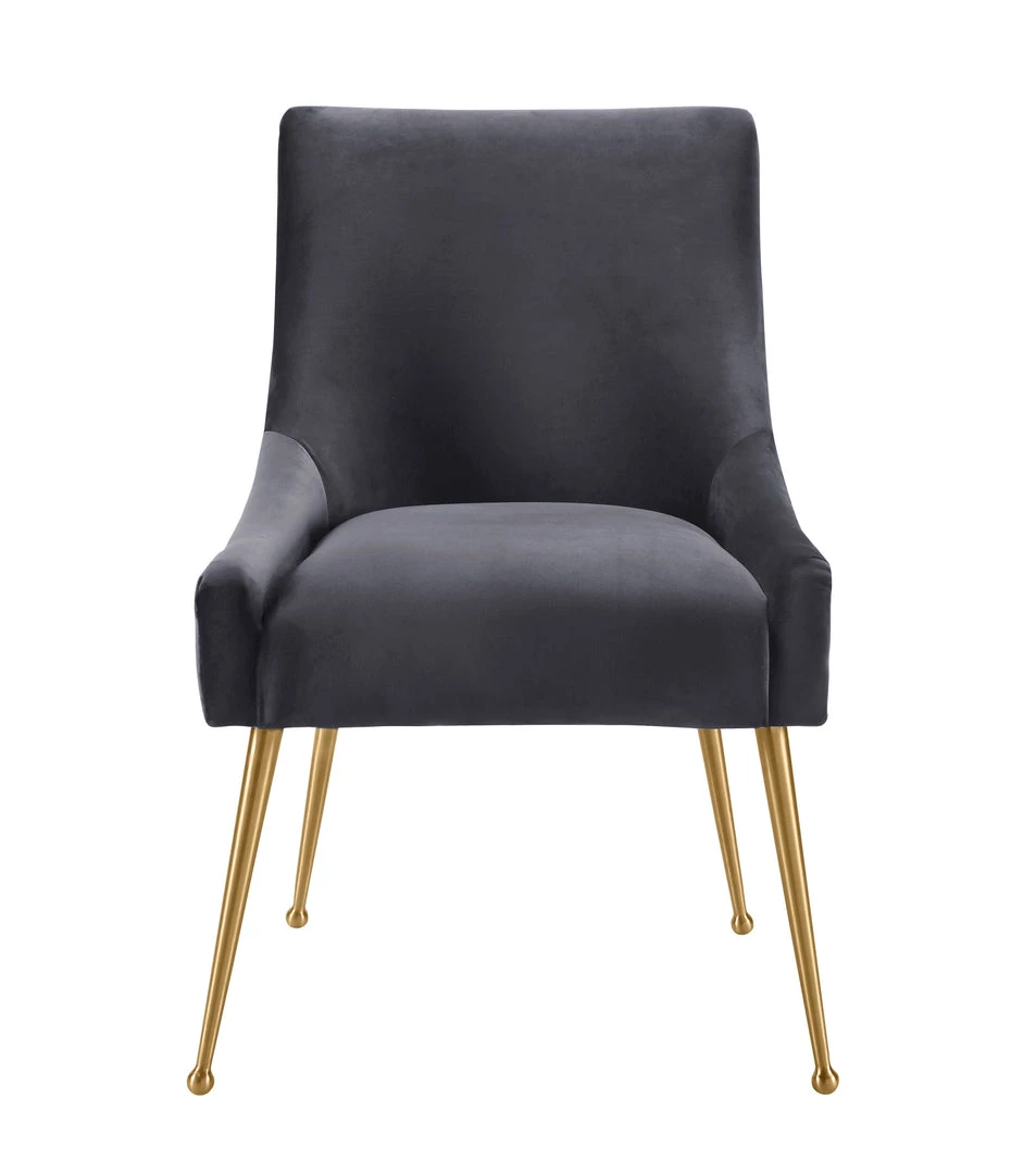Sit pretty in this sumptuous yet durable velvet chair. The Beatrix dazzles as a dining chair or as an accent piece. Available in several colors with fab gold stainless steel legs and a matching handle on the back. Prop it into any room for a luxe, glamour effect.