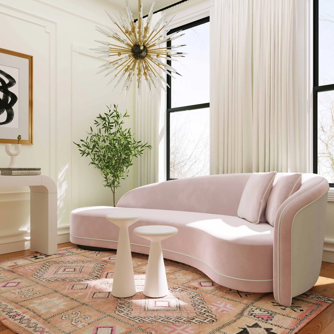 Boasting subtle curves and elegant style, the Carla sofa flawlessly disappears into itself allowing you to glide into seamless relaxation. Its plush velvet upholstery, sloping silhouette and two-tone color design will blend into any decor. Available in multiple color options.