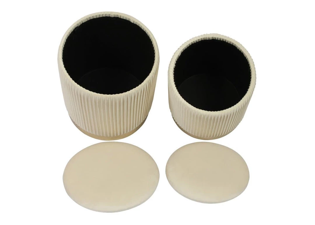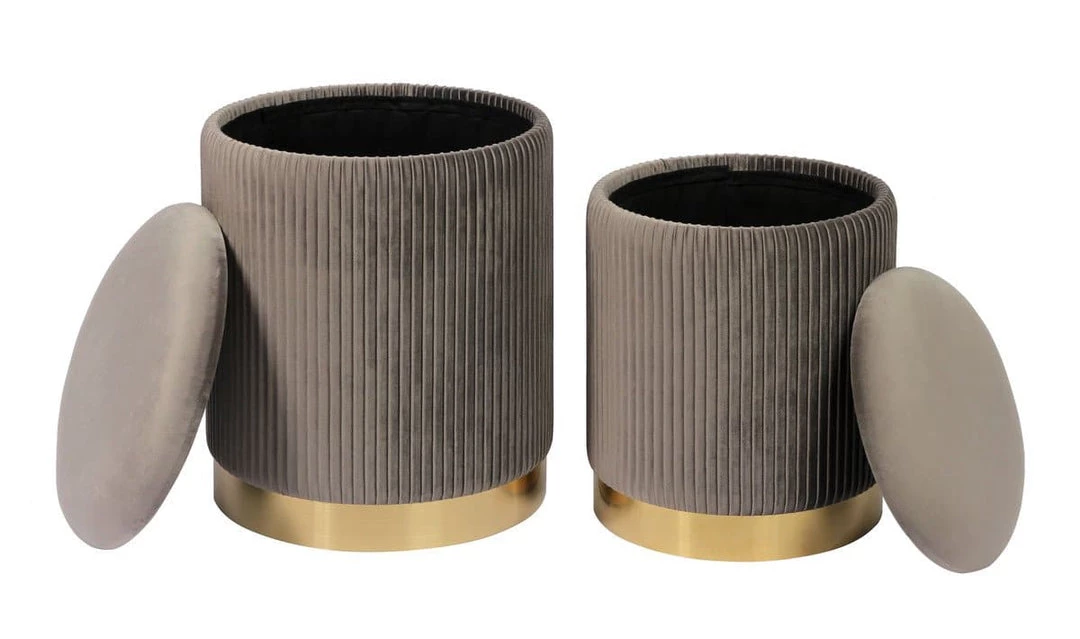 Perfect for small spaces this pleated round ottoman offers both, stunning design and ample storage space. Available in two neutral colors, it’s upholstered in soft velvet and complemented with a brushed gold base. Set includes two ottomans.